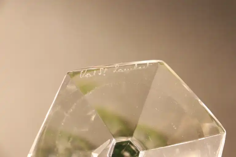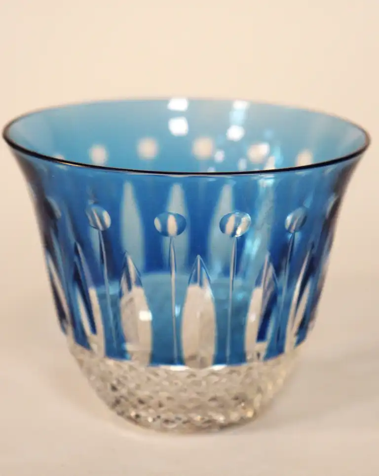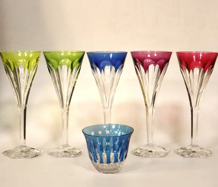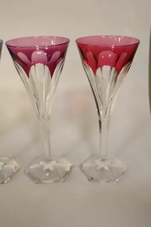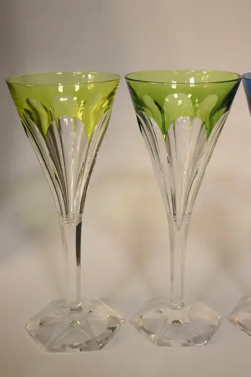 VAL SAINT LAMBERT. Suite de cinq flûtes en cristal en partie coloré. Signées sous la base. H.: 20 cm