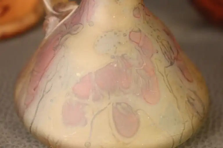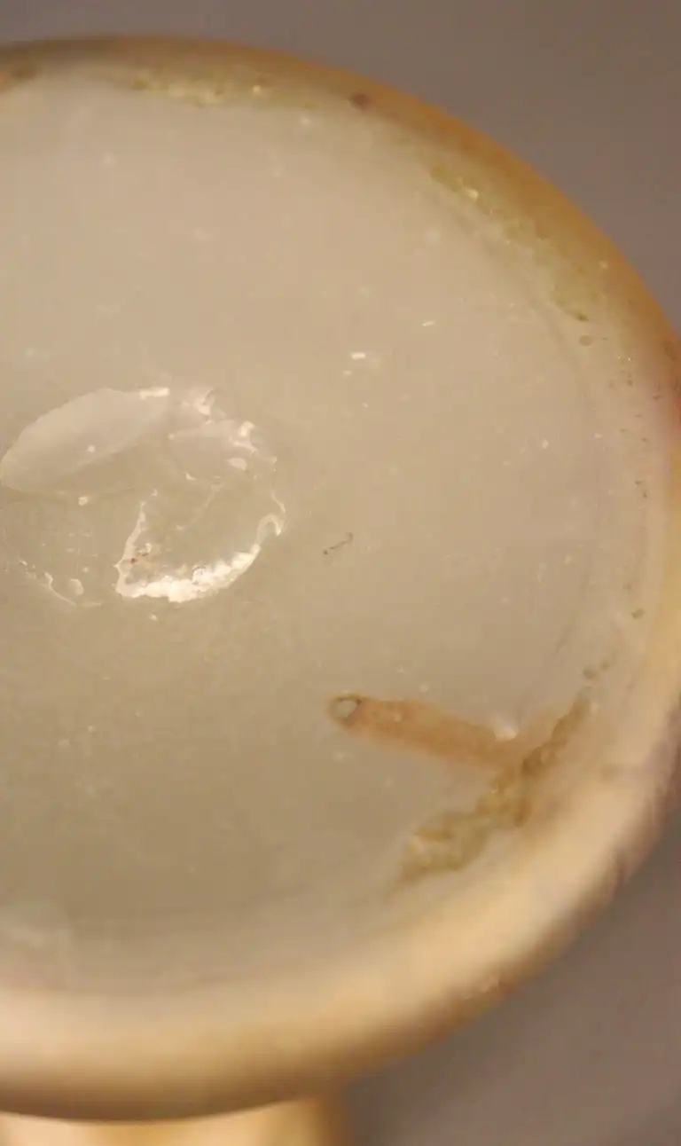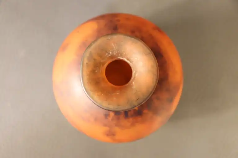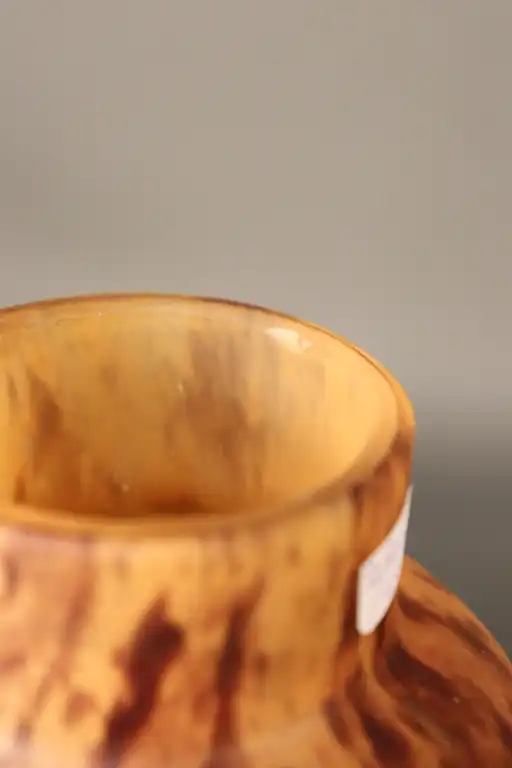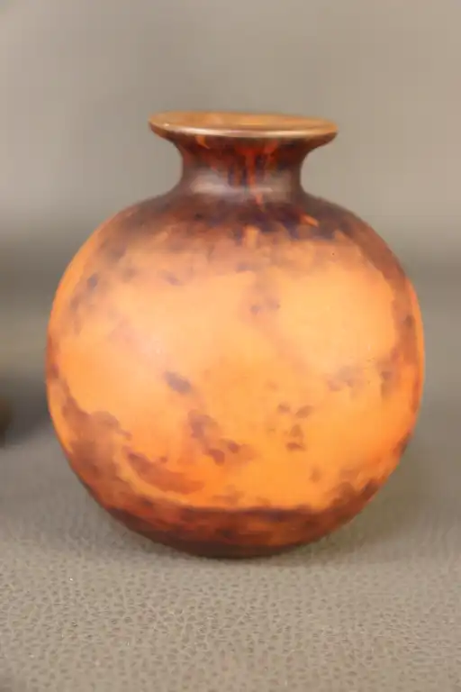 Lot de trois vases en verre moulé dans les tons orangés dont deux à décor marmoréen. H. : de 10,5 à 23 cm à vue. (éclat sous le soliflore, petit éclat au col du vase)