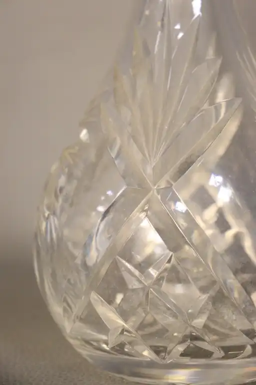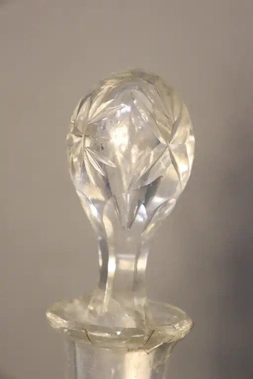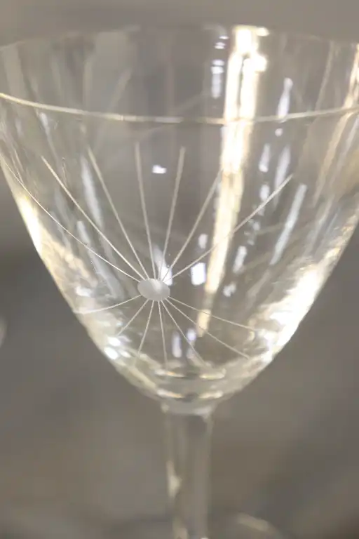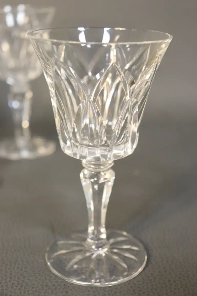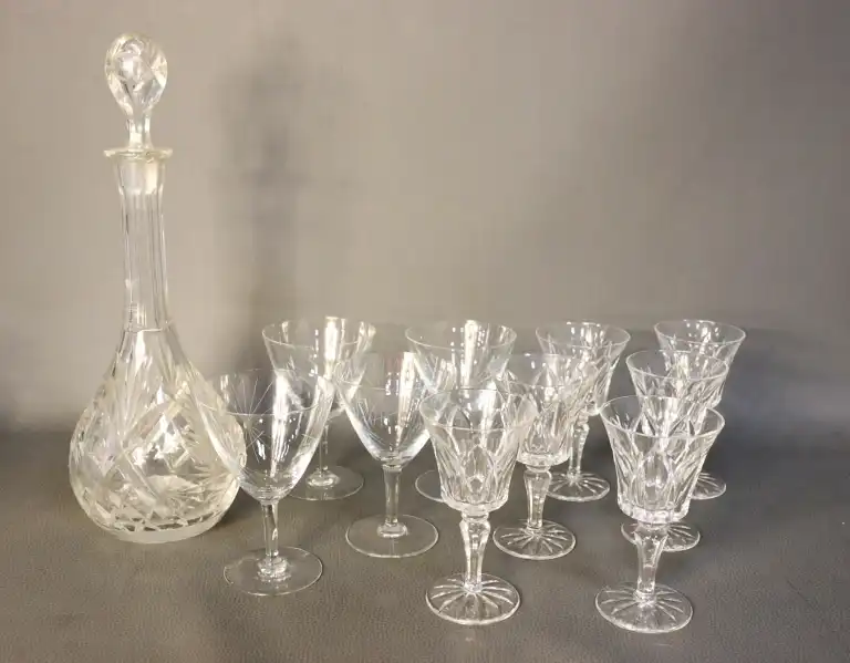 Lot de verreries : quatre verres à eau coniques en cristal à décor gravé d'étoiles, six verres à vin à décor taillé et une carafe avec son bouchon.