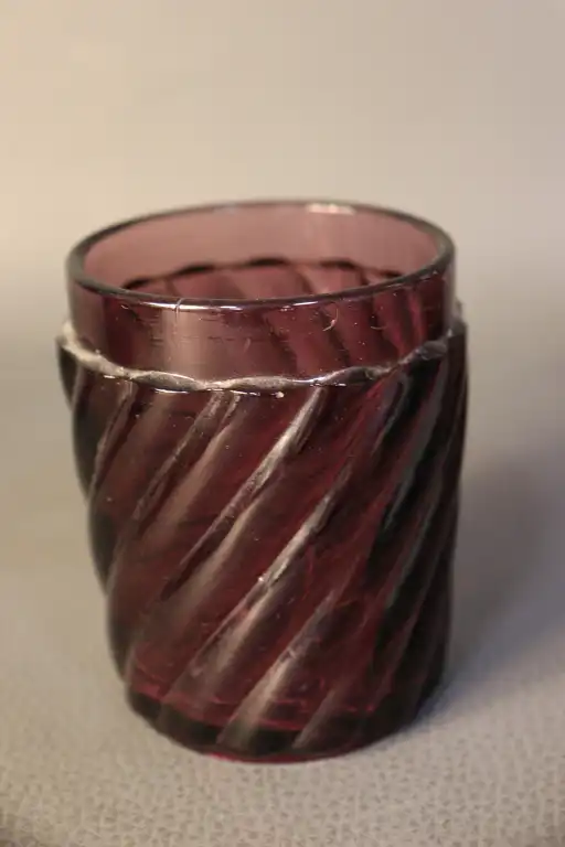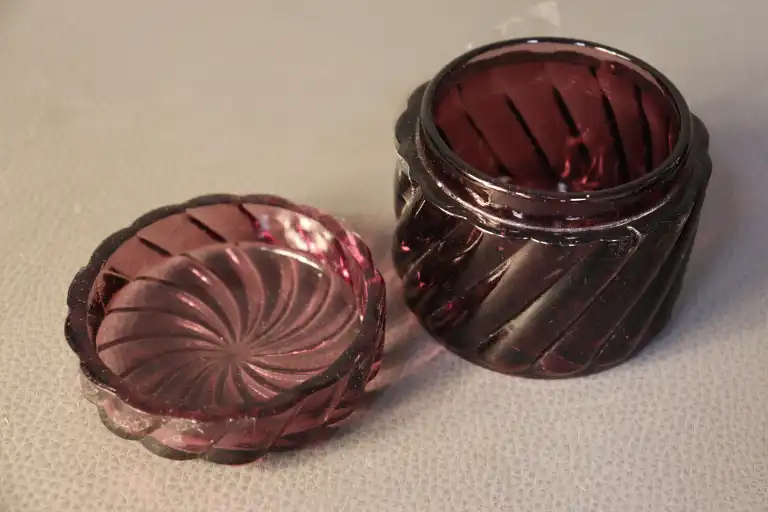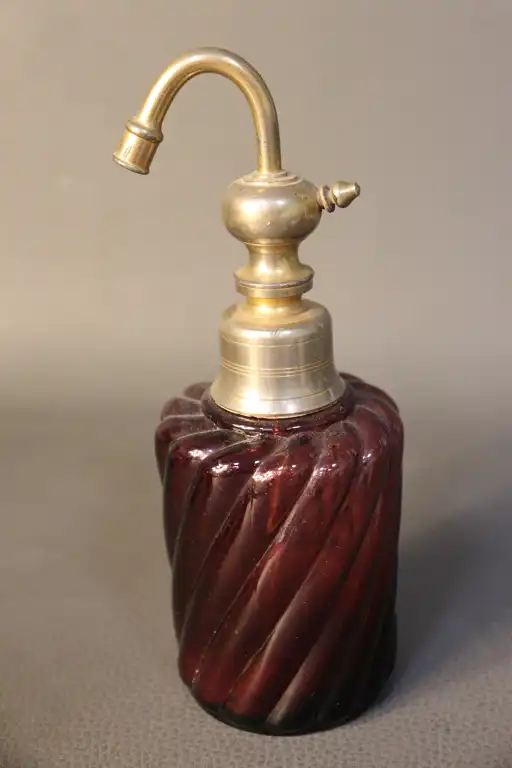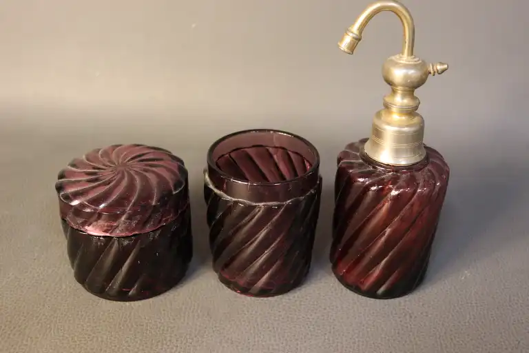 Partie de nécessaire de toilette en verre torsadé violine, comprenant un vaporisateur, un pot couvert et un pot sans couvercle. H. max : 18 cm