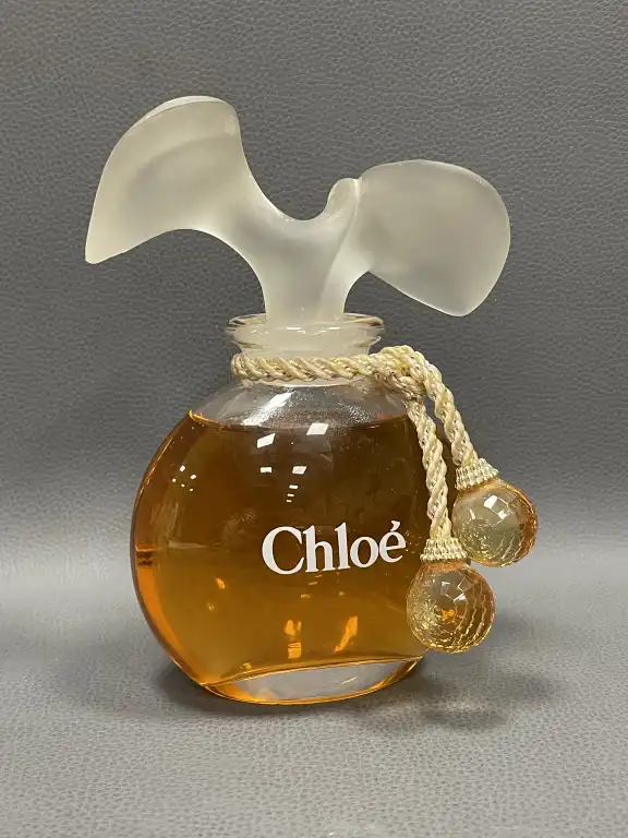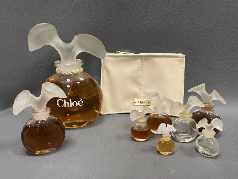 CHLOE par Karl LAGERFELD. Lot de six flacons publicitaires décoratifs (liquide factice) en verre incolore et dépoli pressé moulé. On joint deux flacons similaires miniatures contenant du parfum d'origine et une pochette Parfum CHLOE.