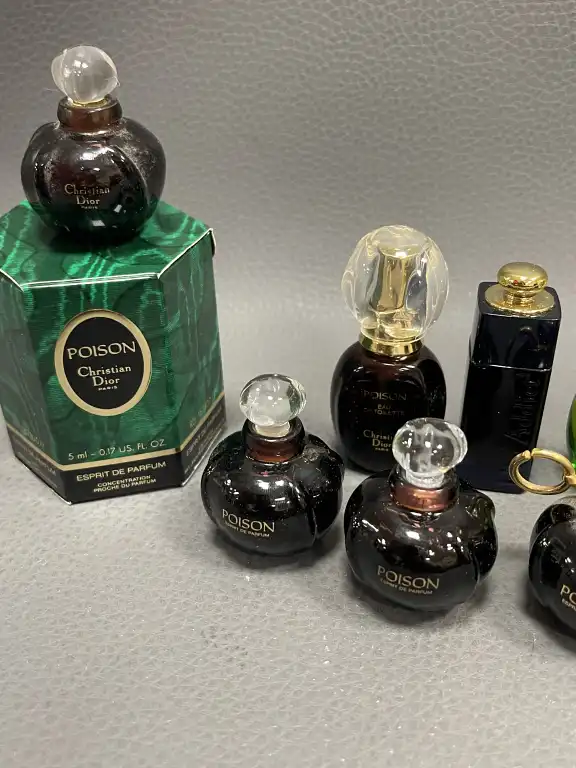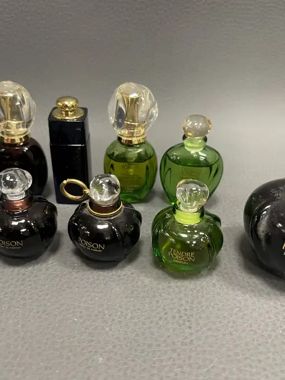 Christian DIOR. Lot de dix flacons miniatures comprenant "Poison", "Tendre Poison" et "Addict". On joint une boîte originale Dior "Poison".