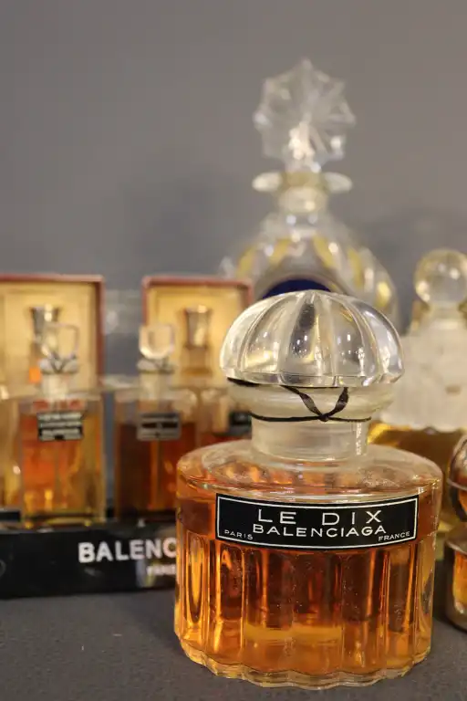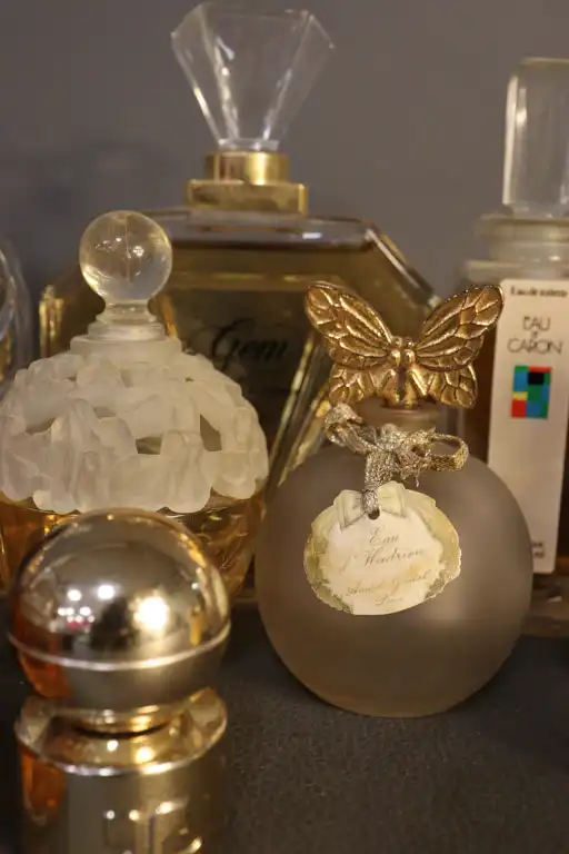 On joint : un flacon de parfum vide « Parfum Sacré » de CARON, une boîte en verre ROGER & GALLET et un flacon sans étiquette COURREGES.