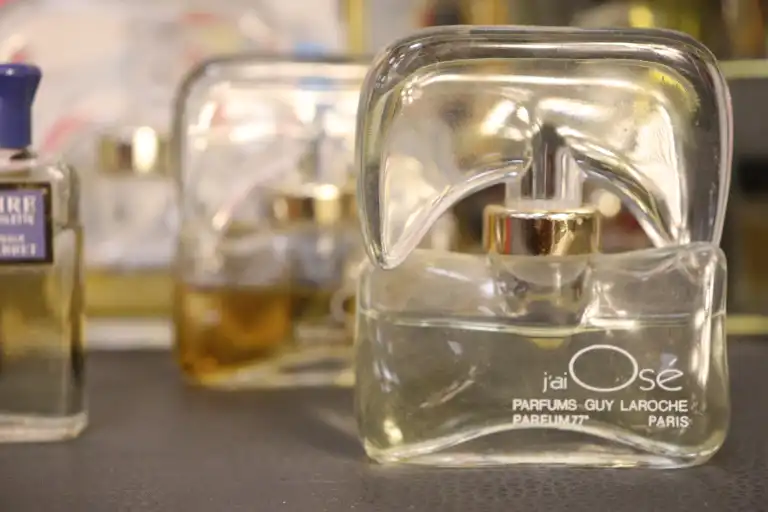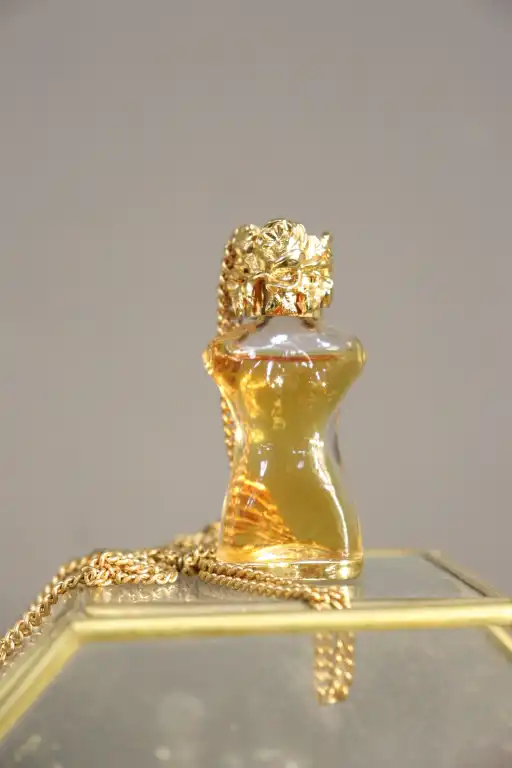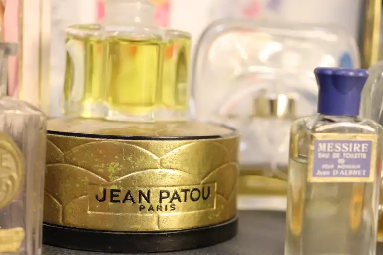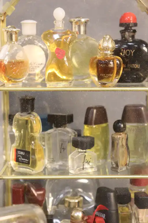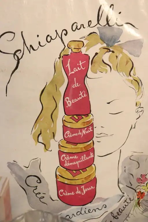 Lot de vitrine avec miniatures de parfums et flacons de parfums dont SCHIAPARELLI, JEAN PATOU, GUY LAROCHE, LENTHERIC... On joint une boîte de poudre et une affiche SCHIAPARELLI. H. 23 cm