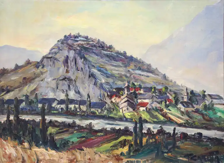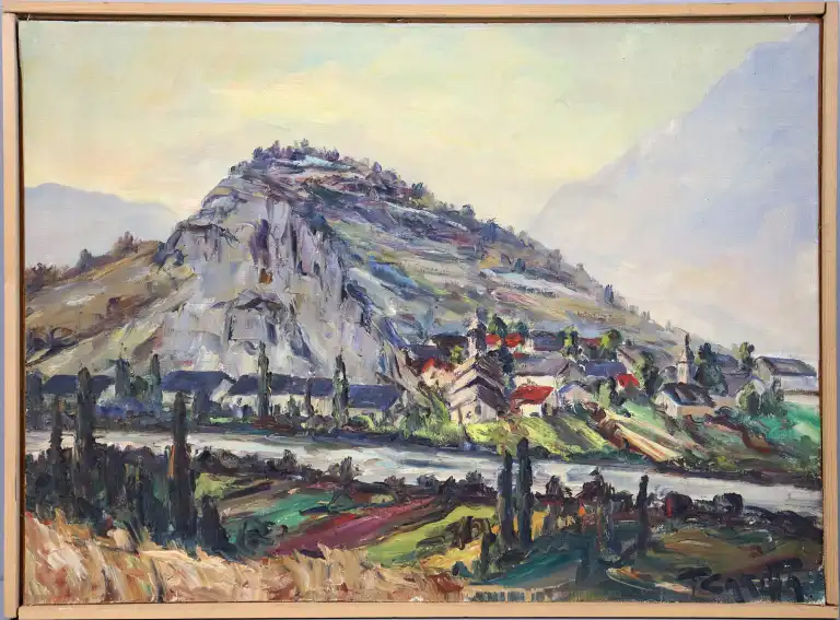 Francis CARIFFA (1890-1975). Vue de Montmélian. Huile sur isorel, signée en bas à droite. 44.5 x 60 cm