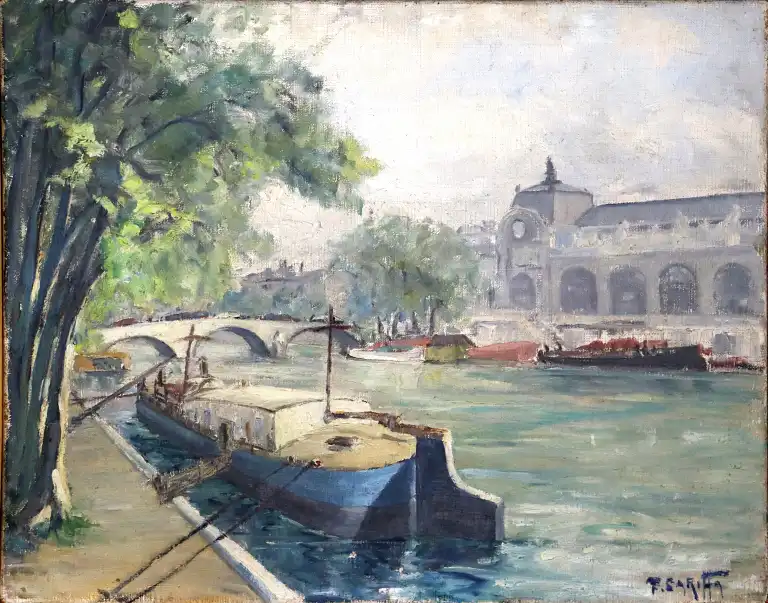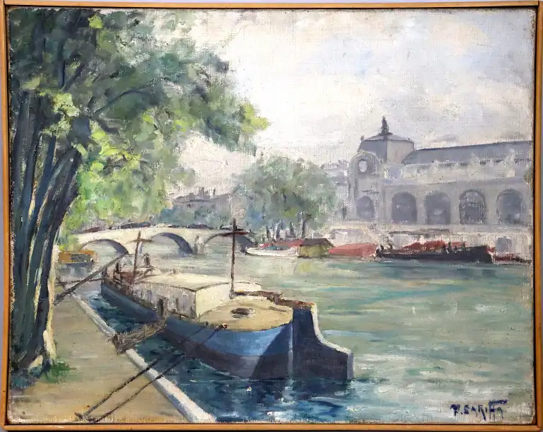 Francis CARIFFA (1890-1975). Pont de Solferino et la gare d'Orsay. Huile sur toile, signée en bas à droite, titrée au dos. 50 x 60 cm