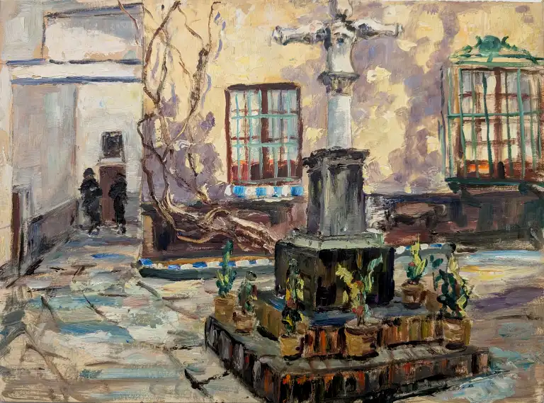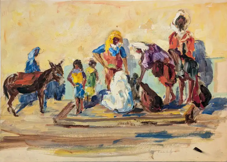 Francis CARIFFA (1890-1975). Groupe de personnes - Vue d'une cour avec calvaire. Deux huiles sur papier, signées en bas à droite et contresignées au dos. 26 x 37 cm