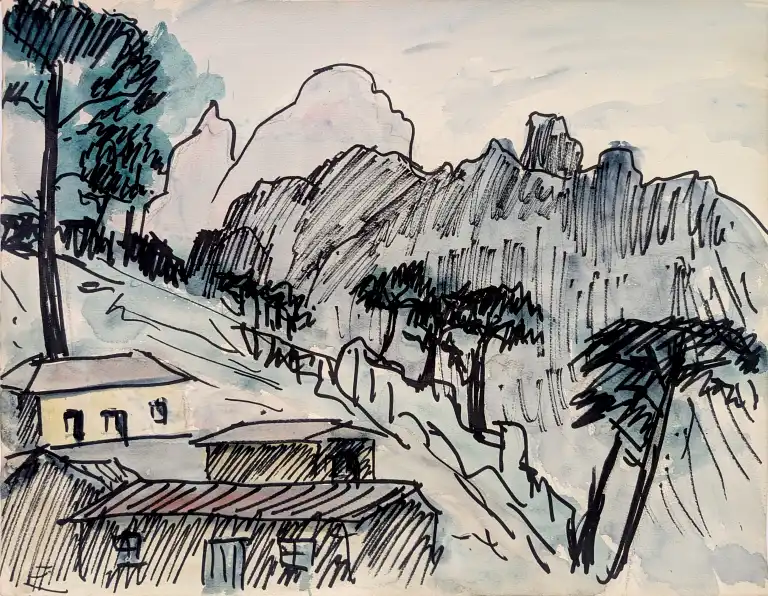 On joint : Francis CARIFFA (1890-1975). Paysage de montagnes. Aquarelle et feutre. Au dos croquis au crayon de montagnes. Non signé. 30 x 37 cm