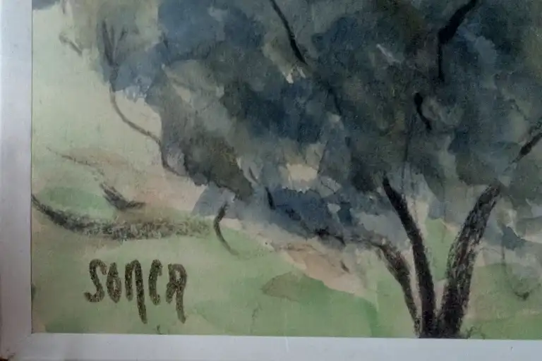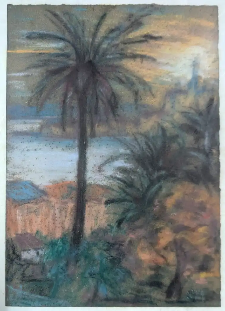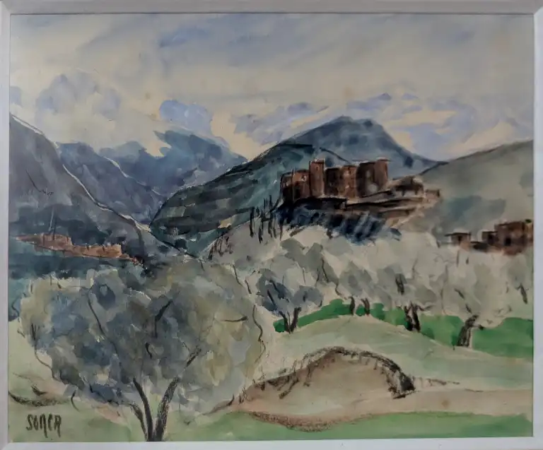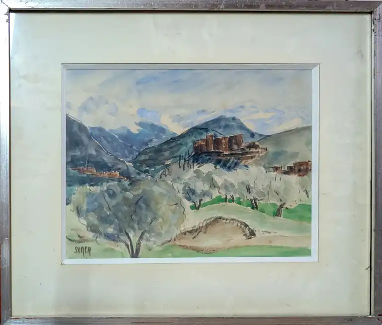 Sonca CARIFFA (1897-1989). Haut-Atlas - Palmiers. Deux dessin à l'aquarelle et pastel. Signés. 22 x 29 cm à vue et 32 x 25 cm