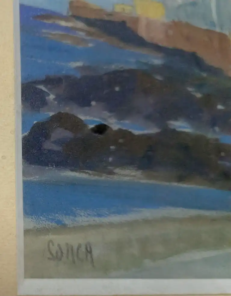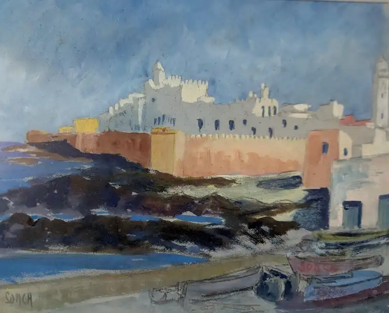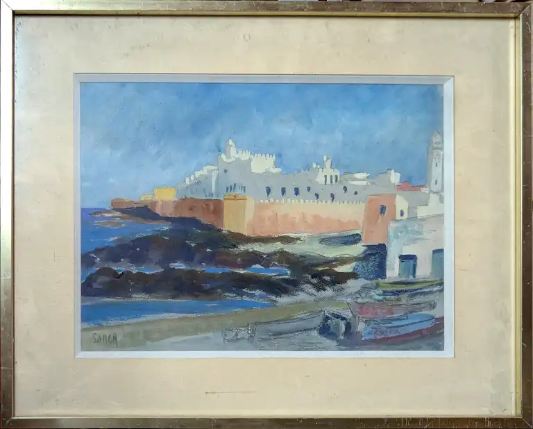 Sonca CARIFFA (1897-1989). Remparts d'Essaouira. Gouache sur papier, signée en bas à gauche et à droite. 23 x 31 cm à vue