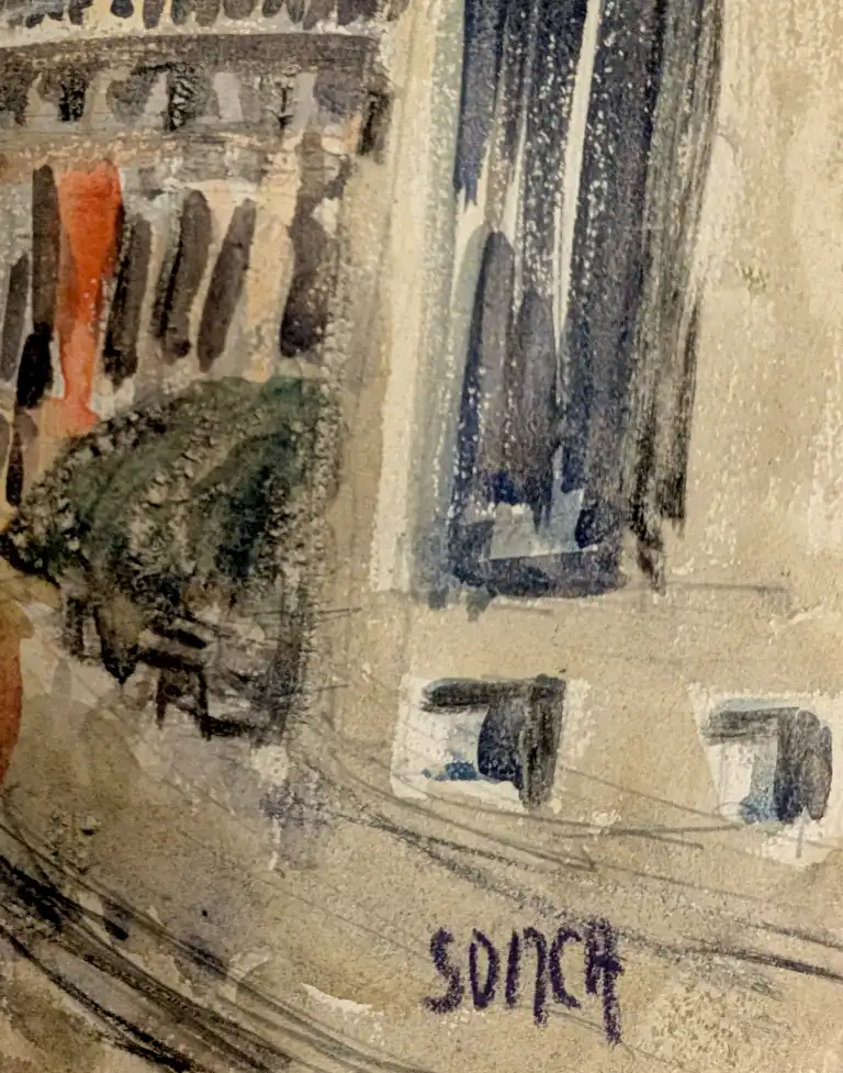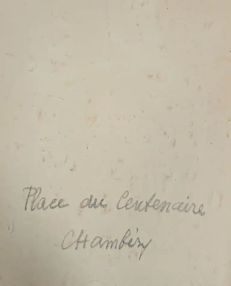Sonca CARIFFA (1897-1989). Place du centenaire à Chambéry. Aquarelle réhaussée de gouache, titrée au dos. 32 x 25 cm