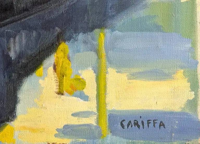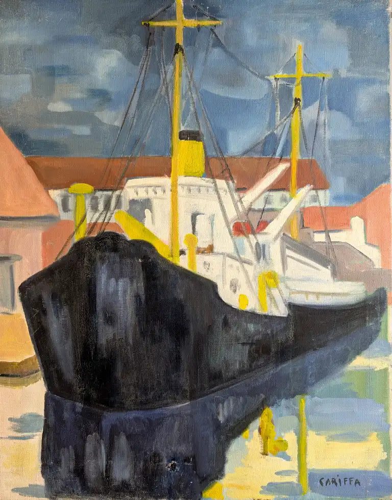 Tonia CARIFFA (1924-2025). Bateau à quai. Huile sur toile, signée en bas à droite. 65 x 50 cm