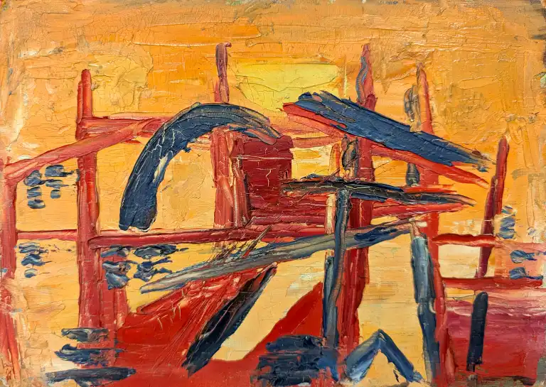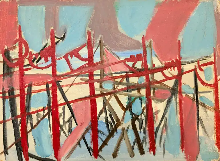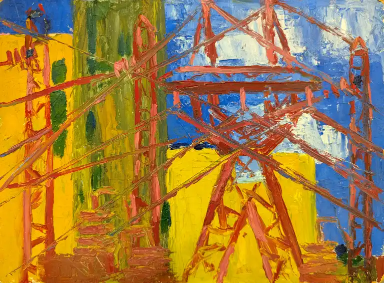 Tonia CARIFFA (1924-2025). Pylônes. Quatre huiles sur panneau dont un signé en bas à droite. 33 x 24 cm , 24 x 33 cm, 16 x 22 cm, 27 x 35 cm
