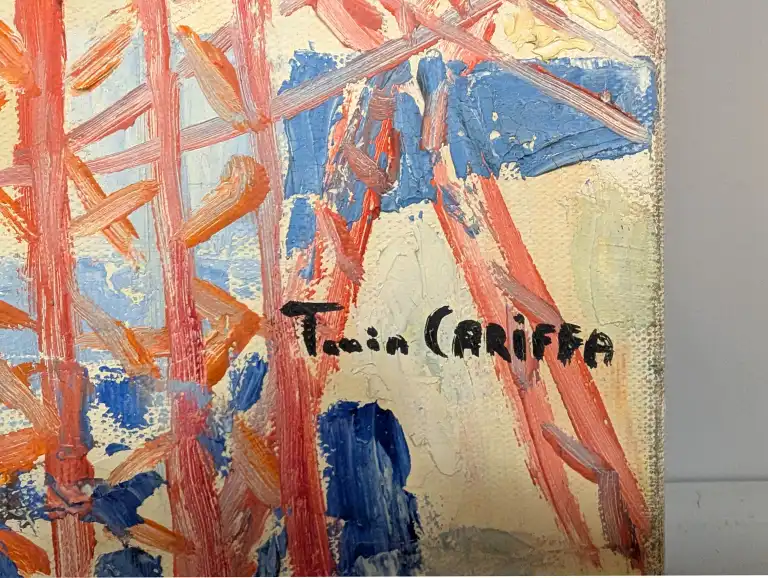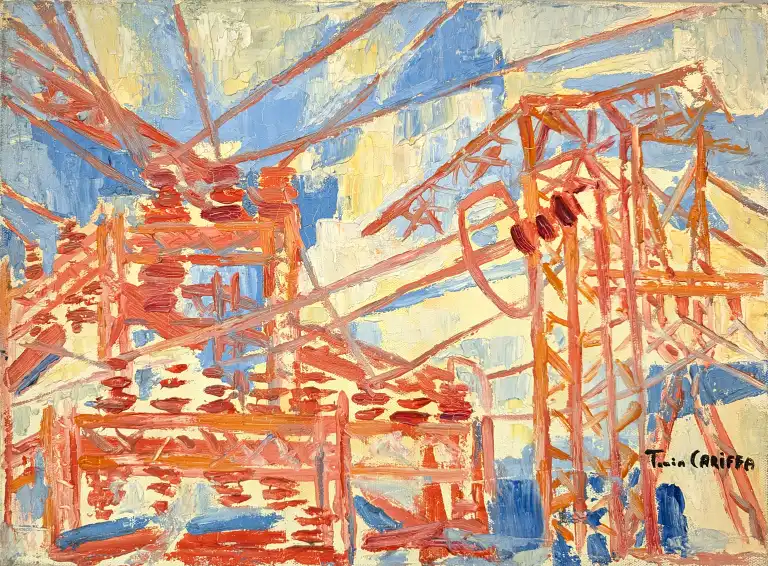 Tonia CARIFFA (1924-2025). Pylônes. Huile sur toile, signée en bas à droite. 33 x 46 cm