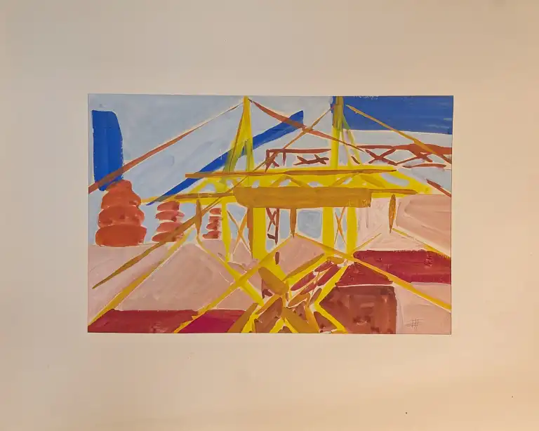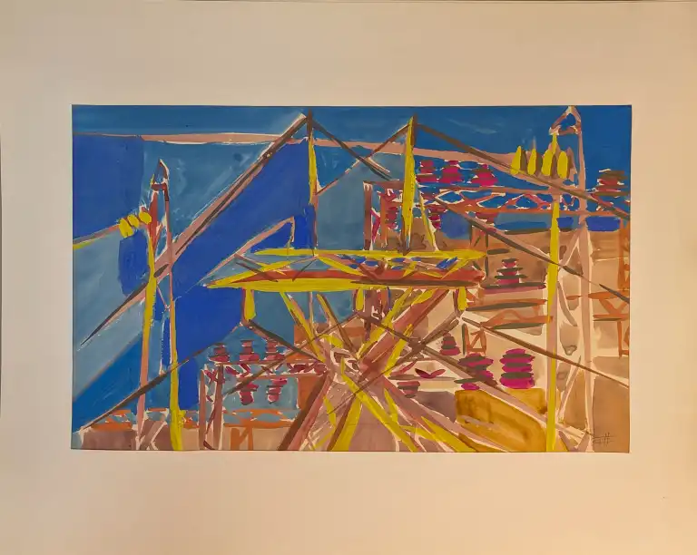 Tonia CARIFFA (1924-2025). Pylônes. Deux dessins à la gouache, signés en bas à droite. 21 x 33 cm, 24 x 39 cm