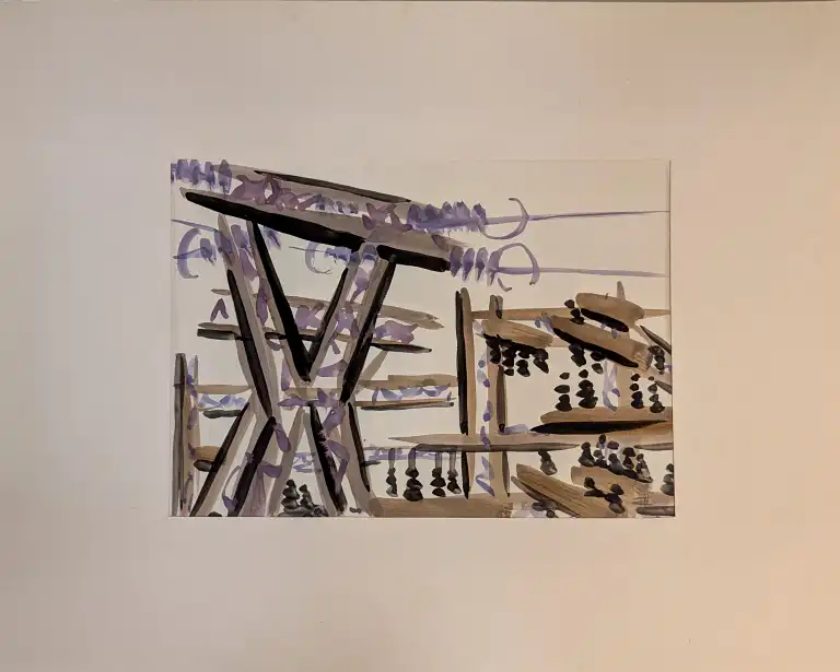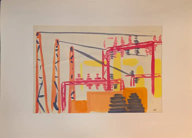 Tonia CARIFFA (1924-2025). Pylônes. Trois dessins à la gouache, signés en bas à droite. 25 x 33 cm, 21 x 31 cm, 21 x 29 cm