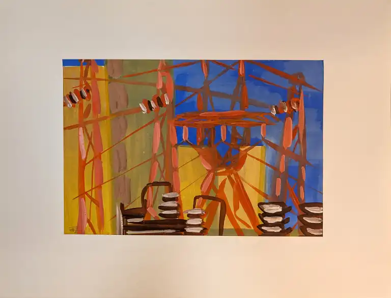 Tonia CARIFFA (1924-2025). Pylônes. Deux dessins à la gouache, signés en bas à gauche. 22 x 30 cm, 23 x 32 cm