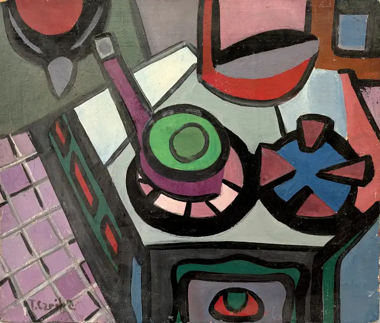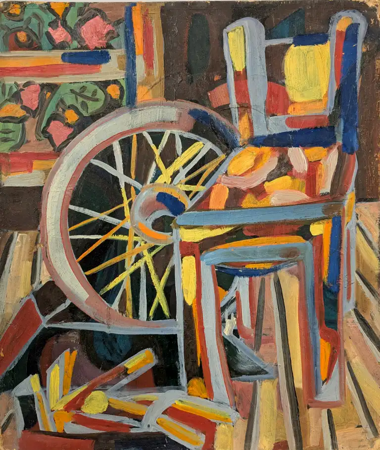 Tonia CARIFFA (1924-2025). Chaise et roue de vélo - Gazinière. Deux huiles sur panneau dont une signée en bas à gauche. 46 x 38 cm et 38 x 46 cm