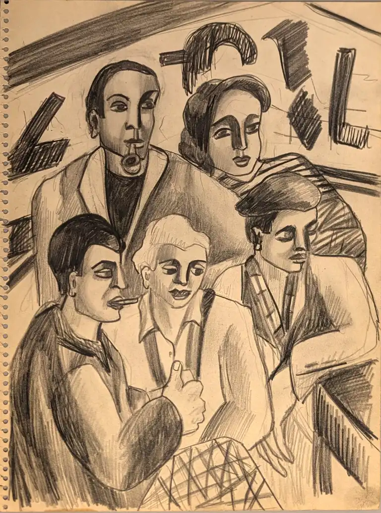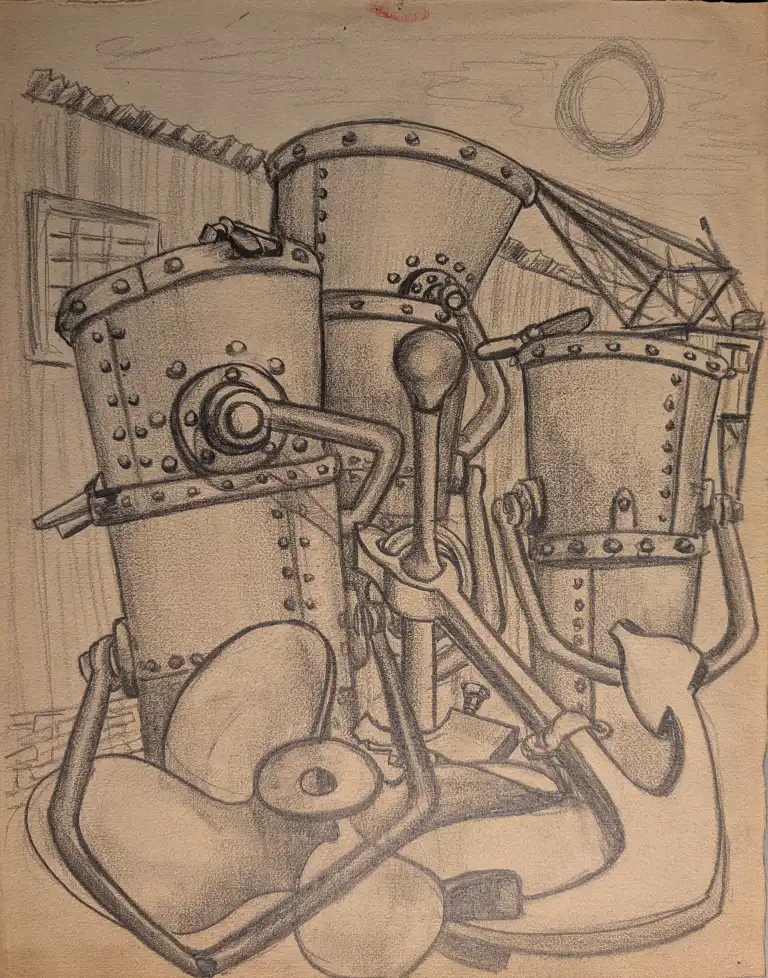 Tonia CARIFFA (1924-2025). Femmes aux longs cheveux et fleurs - Mécaniques de bateau - Portraits d'ouvriers. Trois dessins à la mine de plomb, un daté de 1948. 49 x 64 cm, 33 x 25 cm, 27 x 20 cm