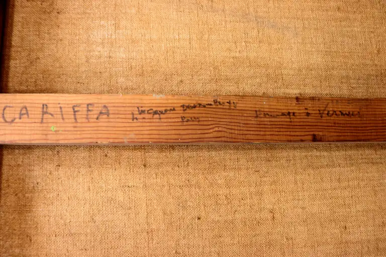 Tonia CARIFFA (1924-2025). Visage d'une jeune fille "Hommage à Vermeer". Huile sur toile, signée et titrée au dos. 162 x 130 cm