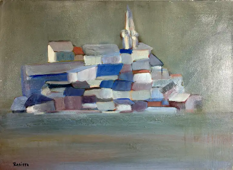 Tonia CARIFFA (1924-2025). Village perché. Huile sur toile, signée en bas à gauche. 54 x 73 cm
