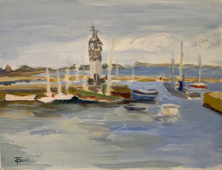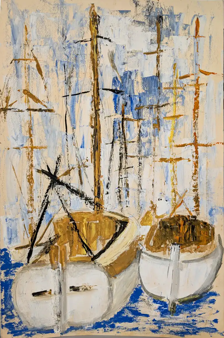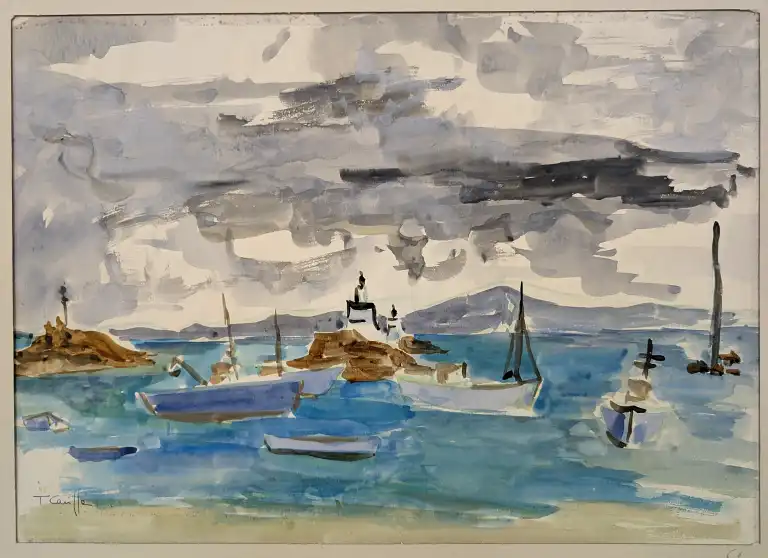 Tonia CARIFFA (1924-2025). Marines avec bateaux de pêche et bâteaux à voile. Quatre dessins : deux aquarelles signées en bas à gauche et datées 1954 et 1948 (dim: 28 x 48 cm, 29 x 42 cm) et deux peintures signées en bas à gauche (dim: 50 x 32, 24 x 32 cm)