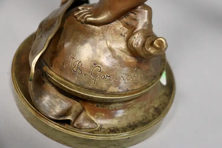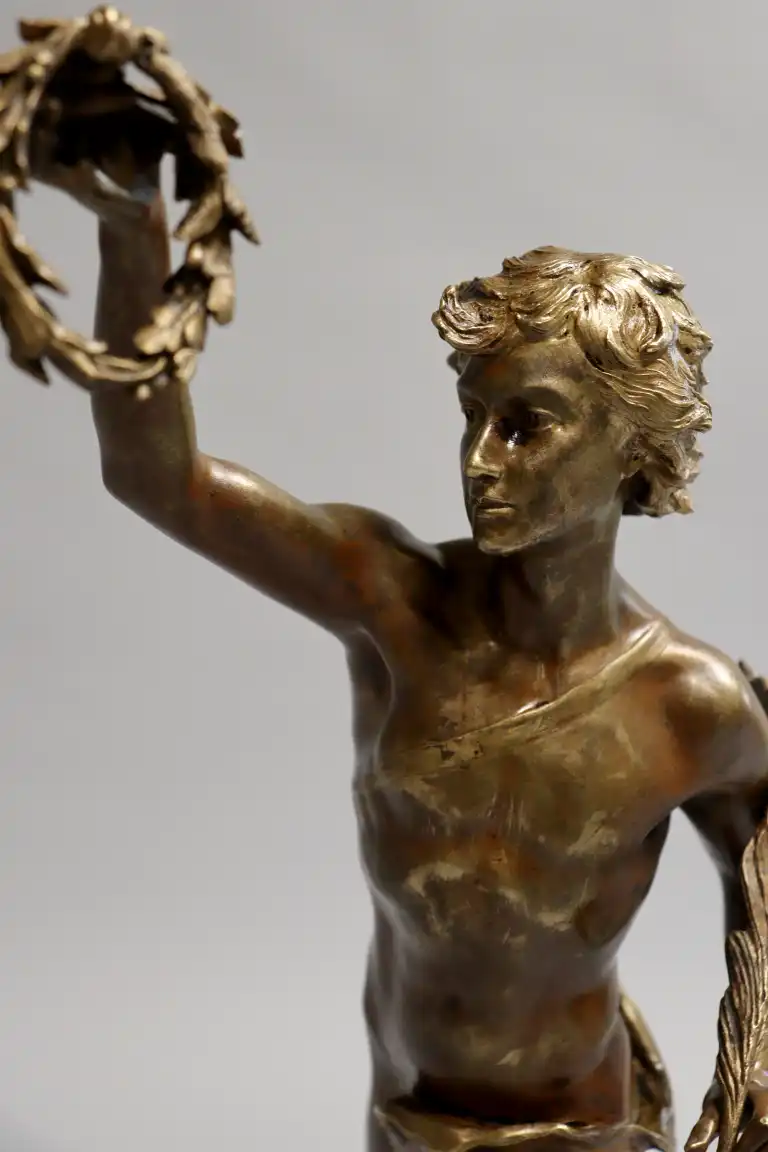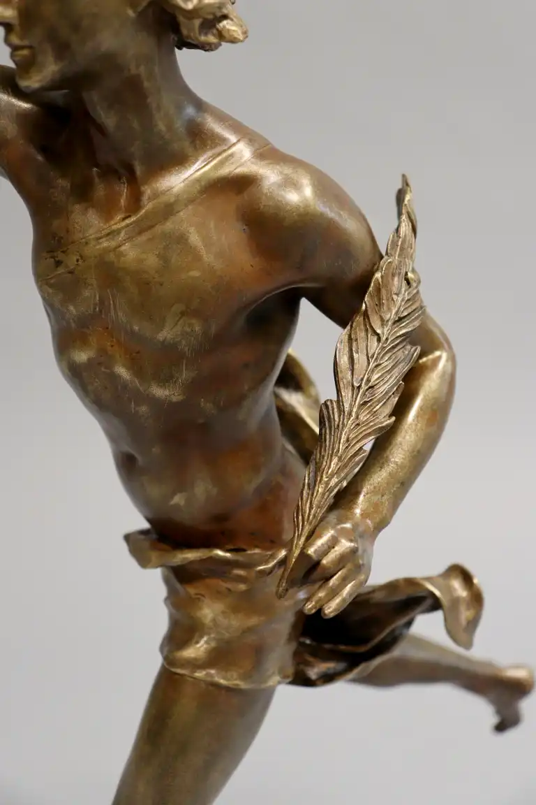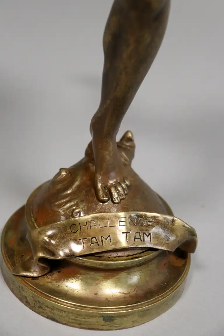 Jean Baptiste GERMAIN (1841-1910) (d'après). Coureur à la palme et couronne de laurier. Epreuve en bronze doré, signée à la base. Inscription :"Challenge Tam Tam". H. : 51,5 cm