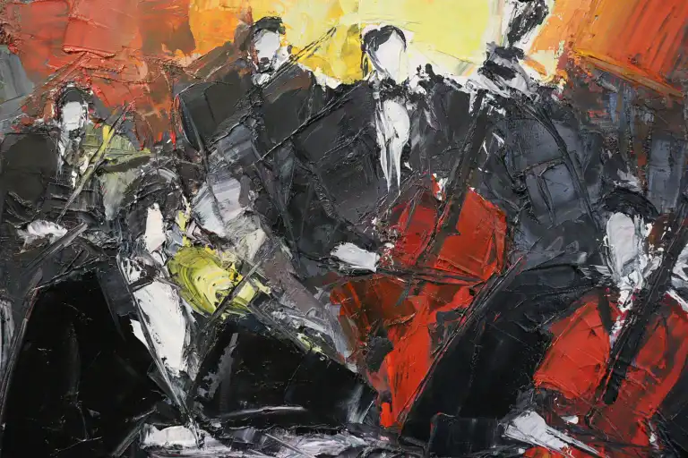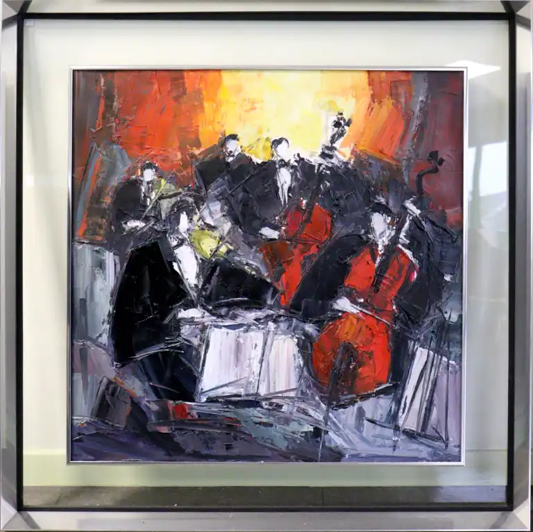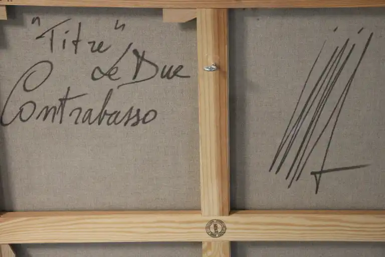 INIS, Francesco GALLO, dit (né en 1965). Le Due Contrabasso (les deux contrebasses). Huile sur toile, signée en bas à droite, contresignée et titrée au dos. 70 x 70 cm