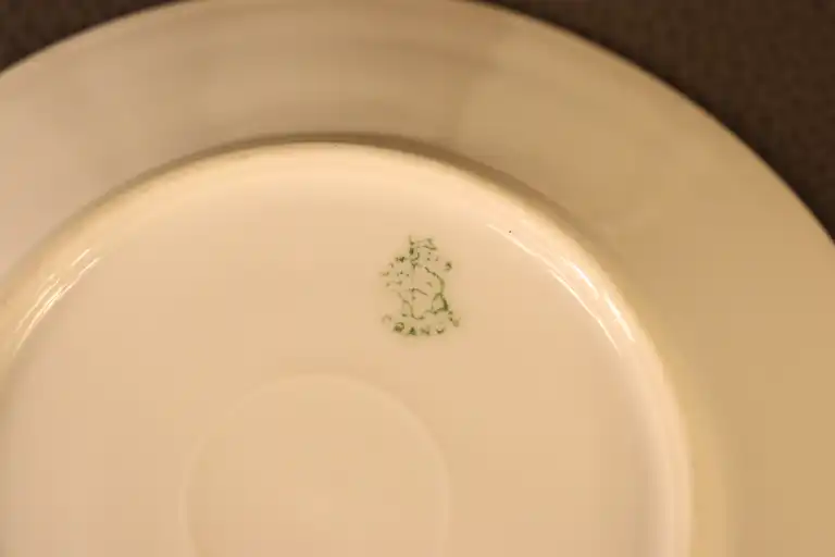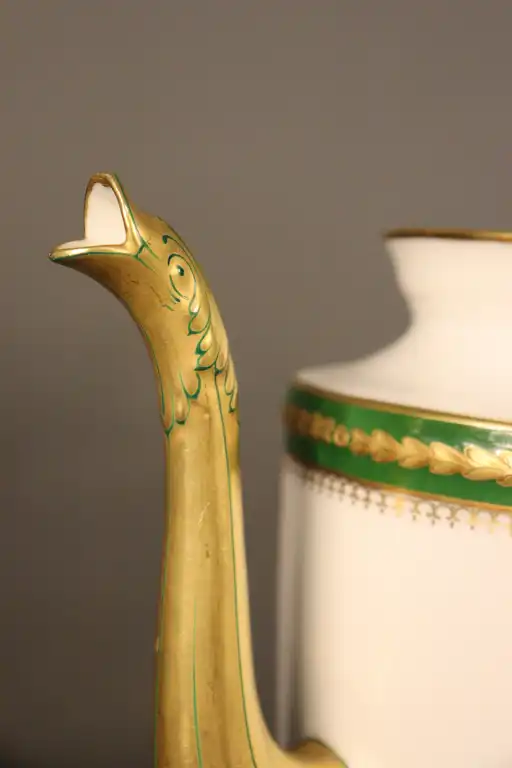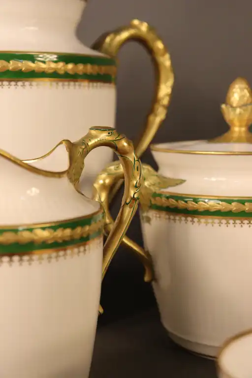 LIMOGES. Partie de service à café en porcelaine blanche à décor de frise de laurier dorés sur fond vert, comprenant : 10 tasses, 12 soucoupes, un pot à lait et une cafetière. Les anses à décor en léger relief d'une tête d'aigle et de cygne. Travail du XIXème siècle. (Egrenures, cassé-recollé)