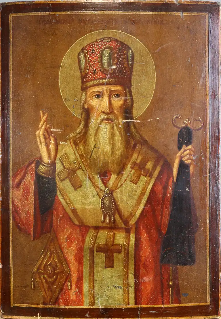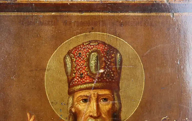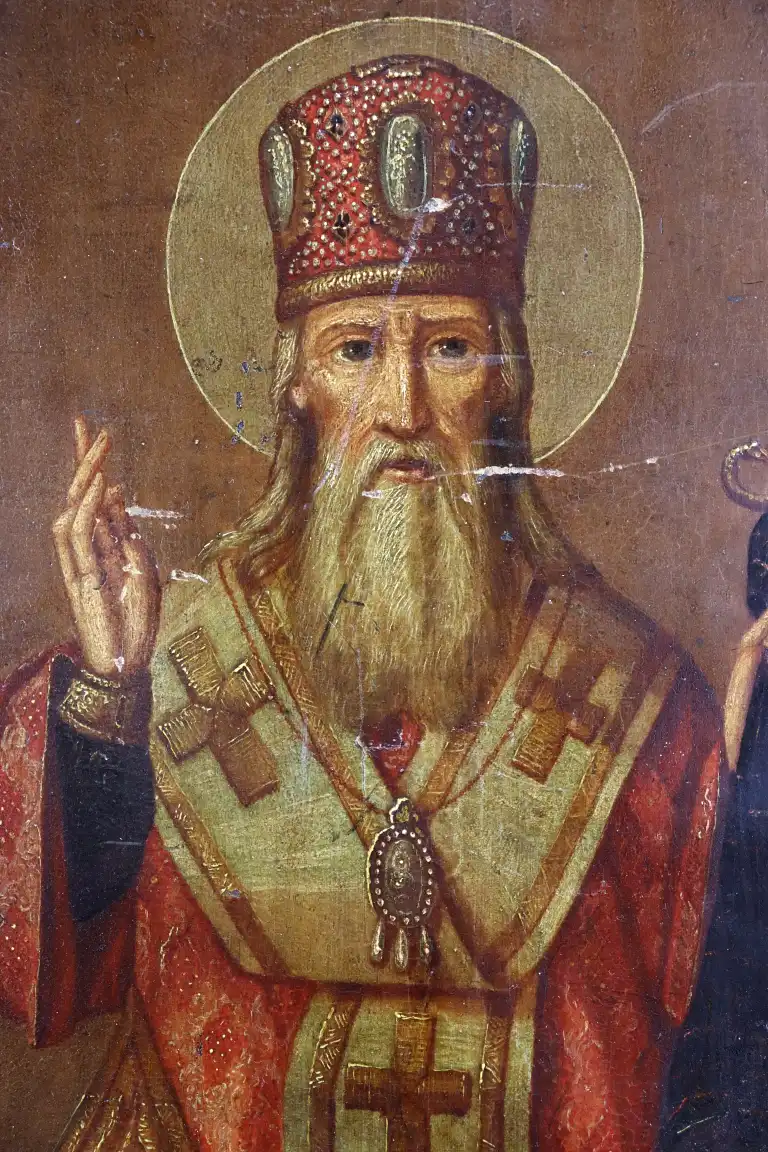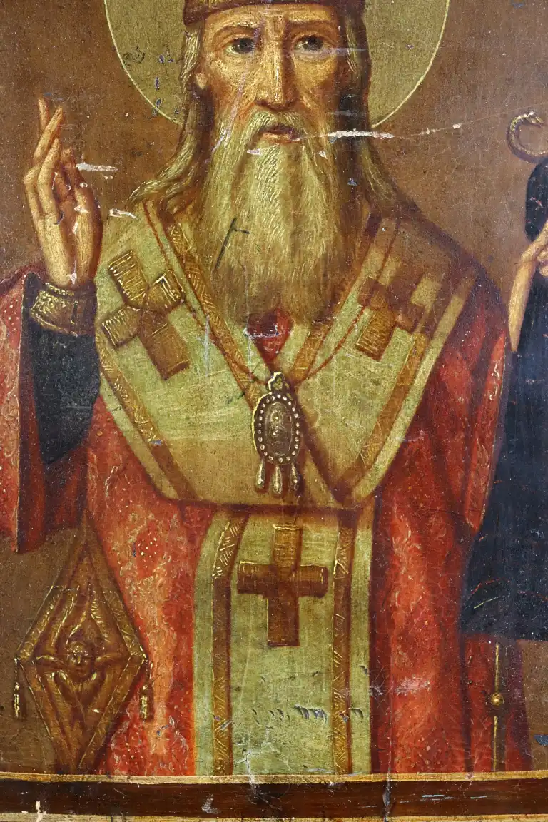 Icône de Saint Nicolas. Tempera sur bois. Travail russe du XIXème siècle. H.: 31 cm - L.: 21, 5 cm. (Usures du temps et manques)