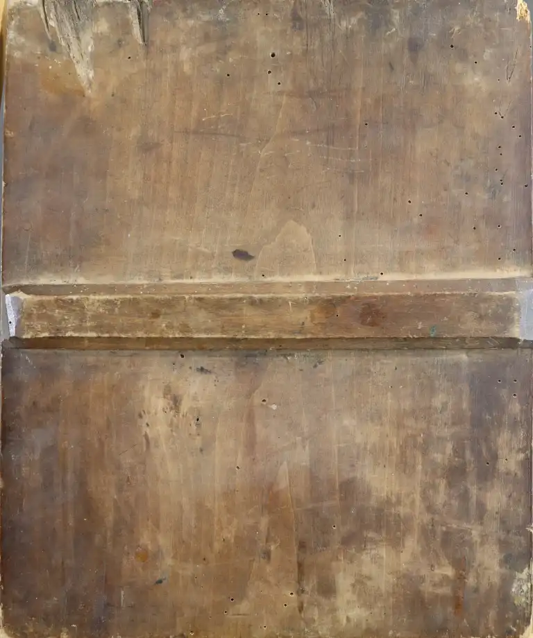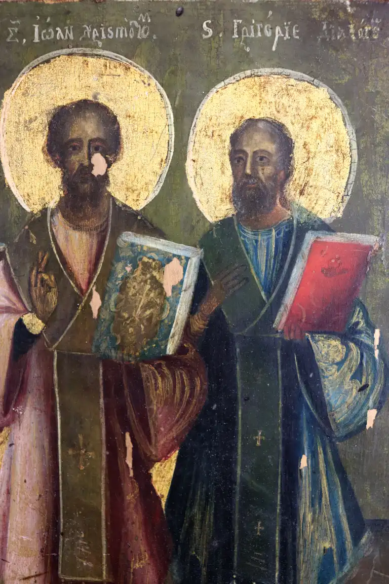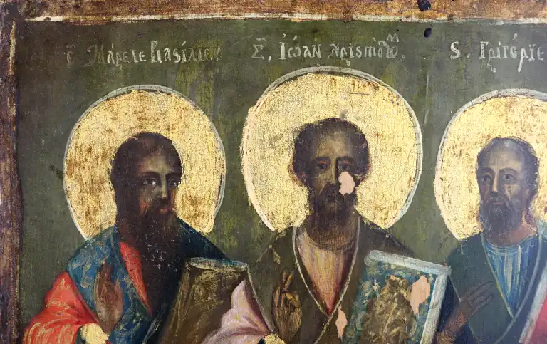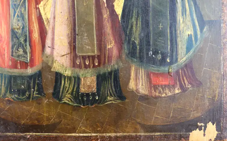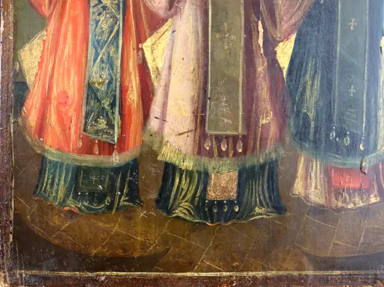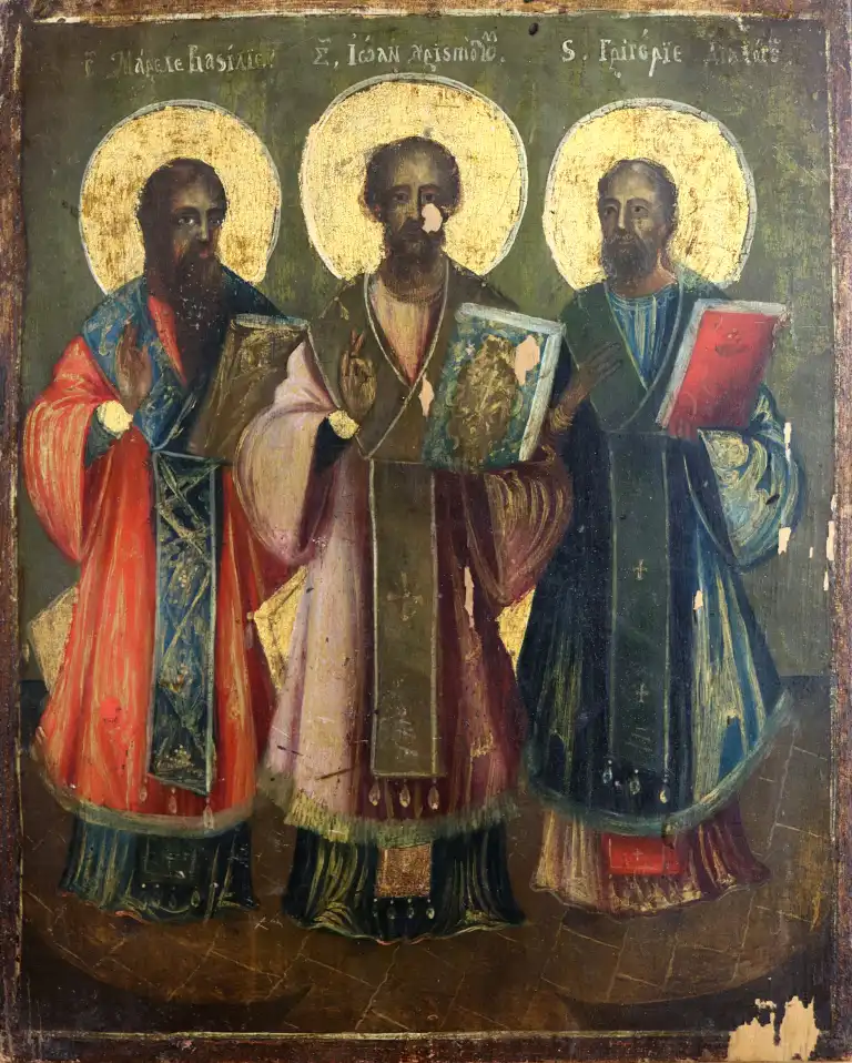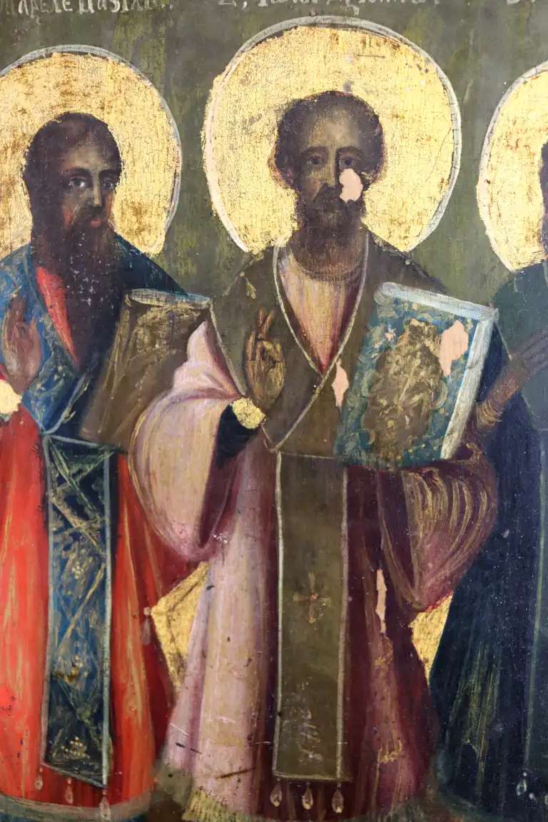 Icône des trois Saints Evêques. Tempera sur bois. Travail grec du début du XXème siècle. H. : 35 cm - L. : 28 cm (Usures du temps, manques en l’état)