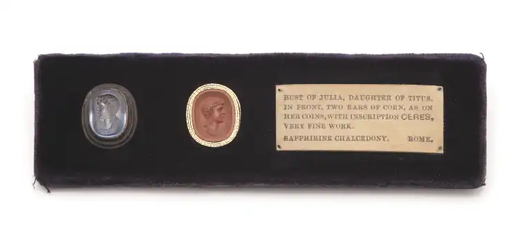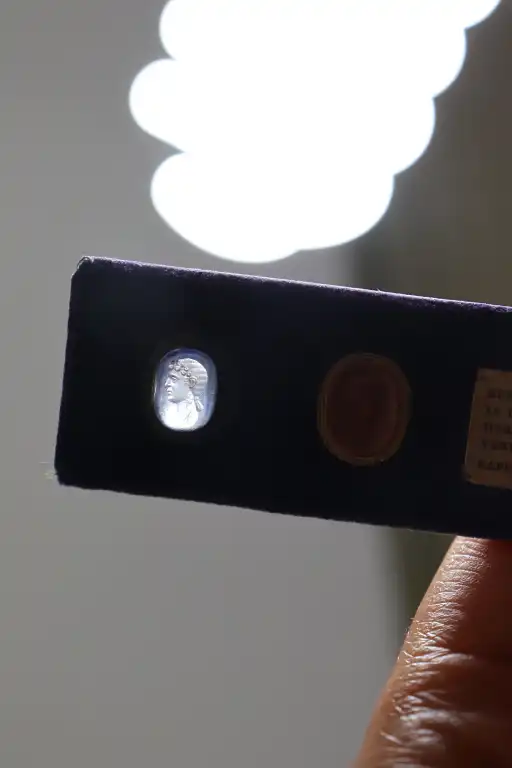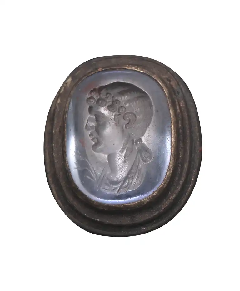 Présentée sur son montage en bois et velours cramoisi datant du début du XXème s., avec une empreinte et un cartel : ( )