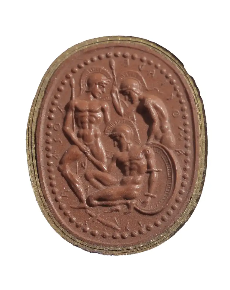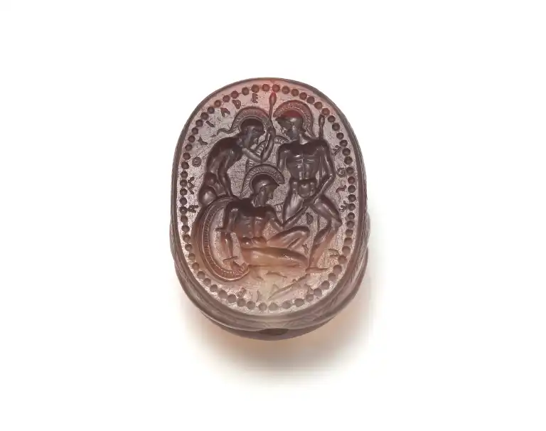 Scarabée gravé sur le plat d’un groupe de trois guerriers dont les noms sont inscrits dans le champ en caractères grecs.