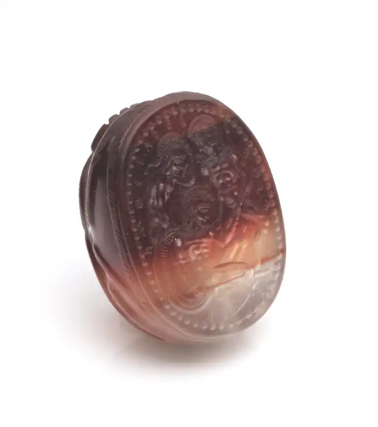Présenté sur son montage en bois et velours cramoisi datant du début du XXème s., avec une empreinte et un cartel : ( ) FOUND IN SICILY
