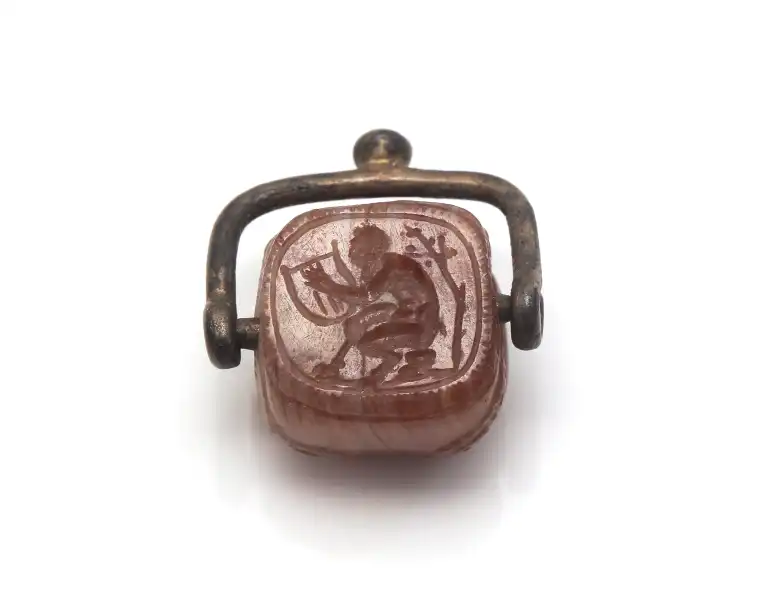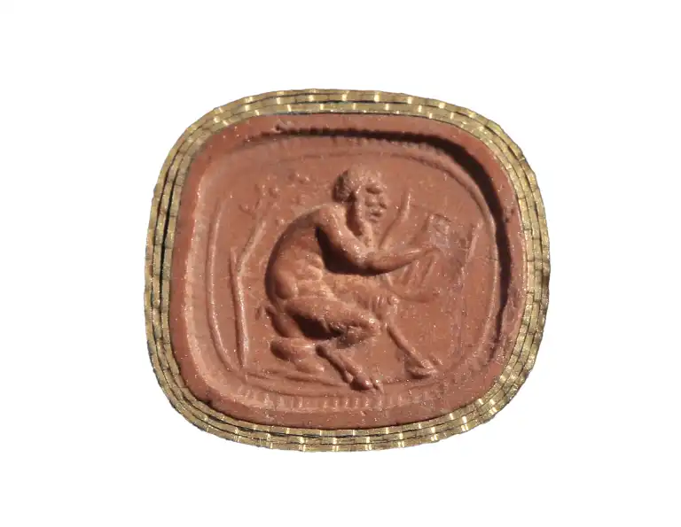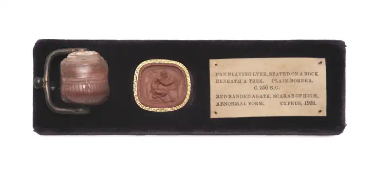 Scarabée de forme compacte. Le dieu Pan assis à droite sous un arbre, en train de jouer de la lyre. Listel et bordure hachurée