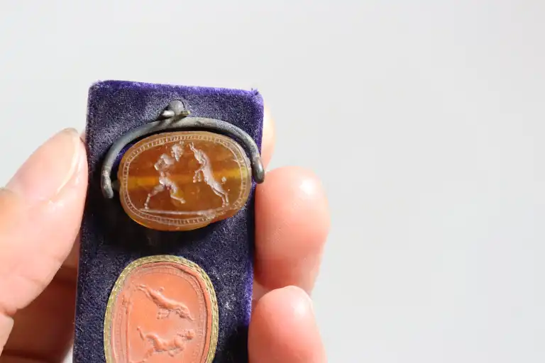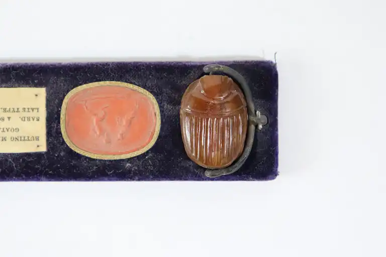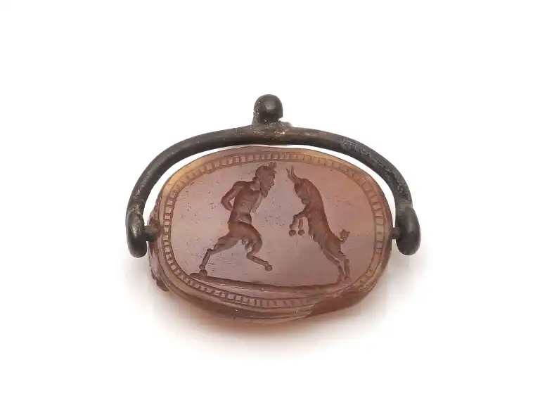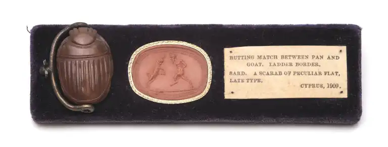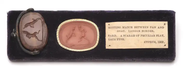 Scarabée. Satyre et bouquetin s’élançant l’un contre l’autre. Ligne de sol. Bordure hachurée.