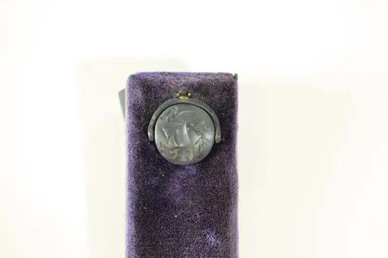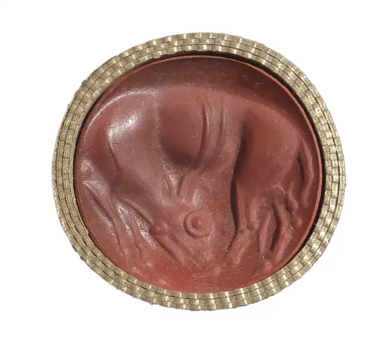 Présenté sur son montage en bois et velours cramoisi datant du début du XXème s., avec une empreinte et un cartel : bull or cow licking its hind led. Spartan basalt (lapis lacedaemonius).