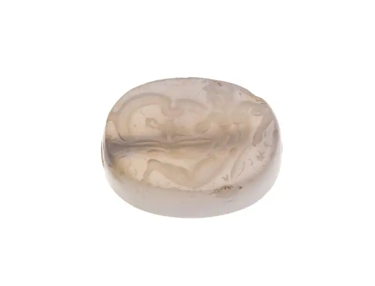Scaraboïde. Un guerrier étendu, casqué, tenant un bouclier et une épée (makhaira)