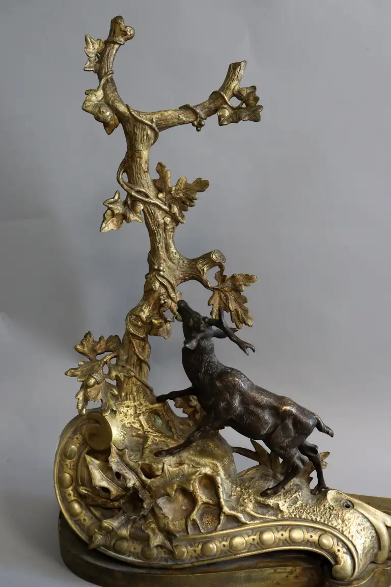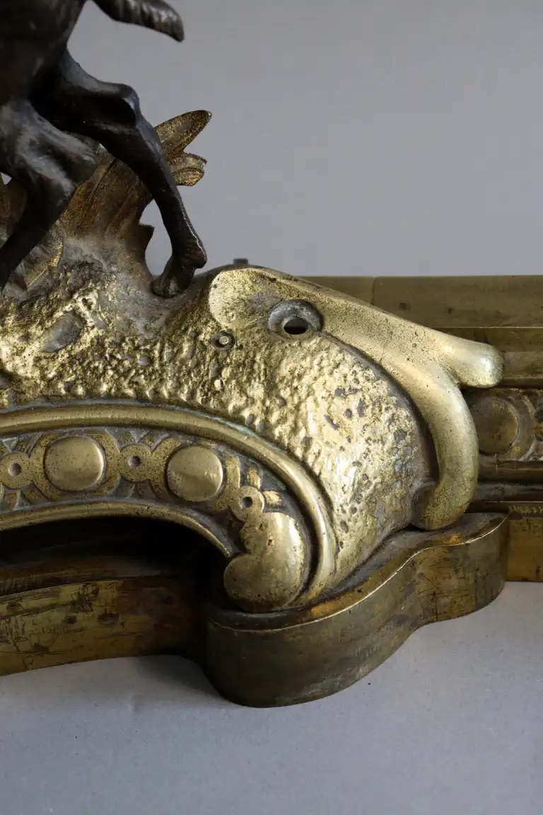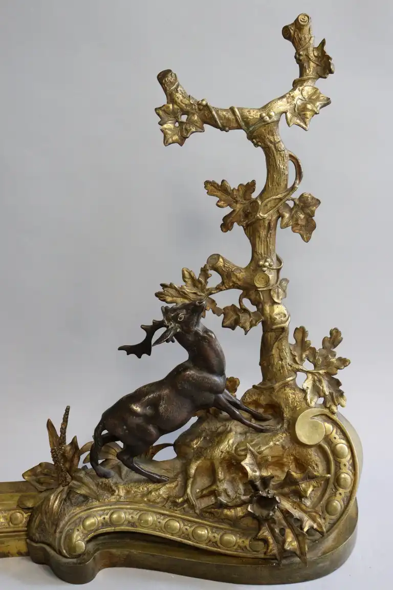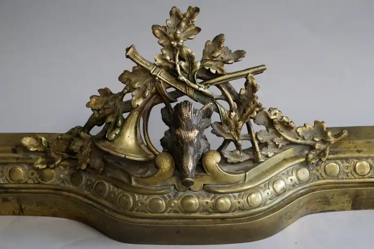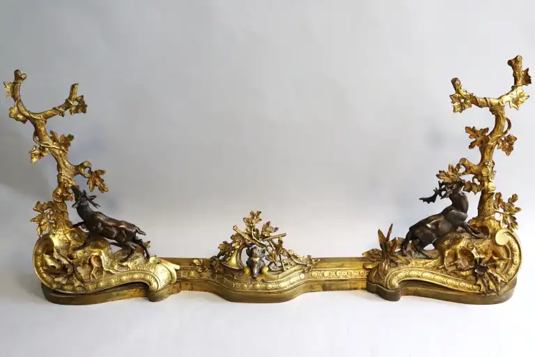 Importante barre de foyer en bronze ciselé, doré et patiné figurant à chaque extrémité un cerf au pied d’une branche et au centre un trophée de chasse à la hure de sanglier, base rocaille. Style Louis XV. H.: 55 cm - L.: 122 cm - P.: 18 cm