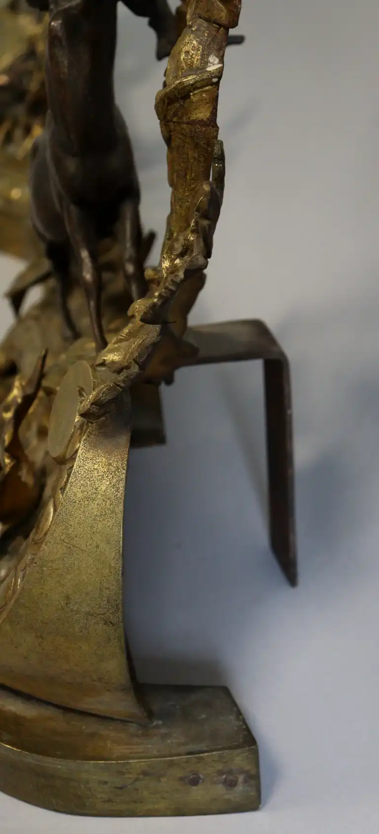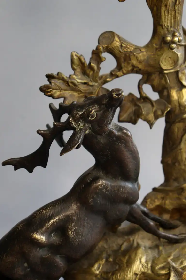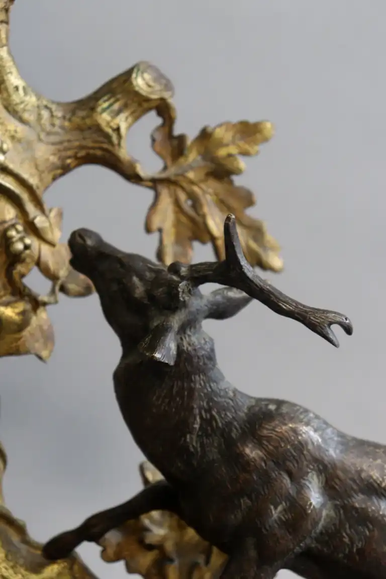 Importante barre de foyer en bronze ciselé, doré et patiné figurant à chaque extrémité un cerf au pied d’une branche et au centre un trophée de chasse à la hure de sanglier, base rocaille. Style Louis XV. H.: 55 cm - L.: 122 cm - P.: 18 cm