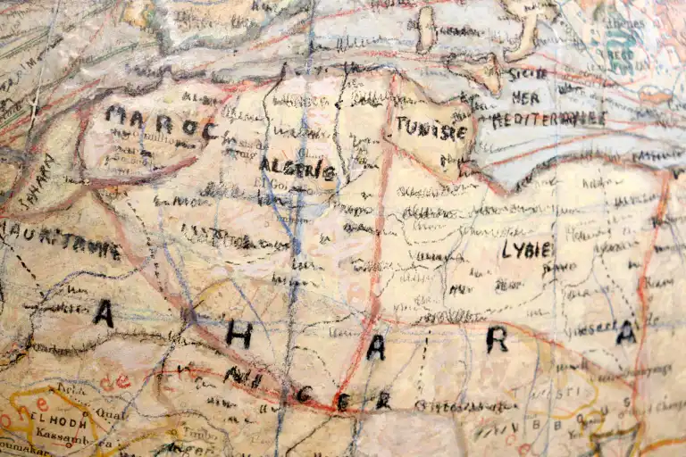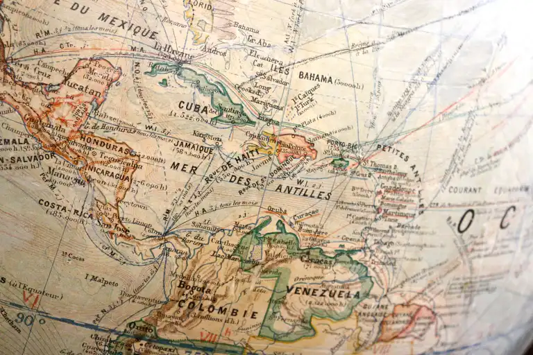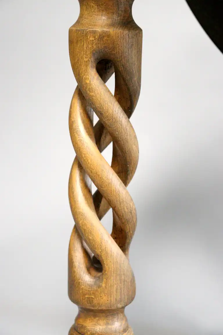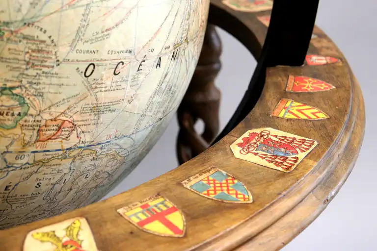 IKELMER à Paris. Grand globe terrestre en carton imprimé, monté sur son support en bois à quatre pieds torsadés ajourés réunis par une entretoise. Le cercle équatorial orné de blasons. Dessin de E. Dubail, gravé par A. Soldan.