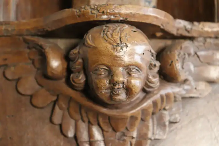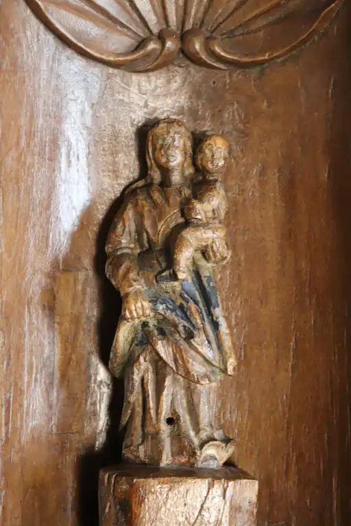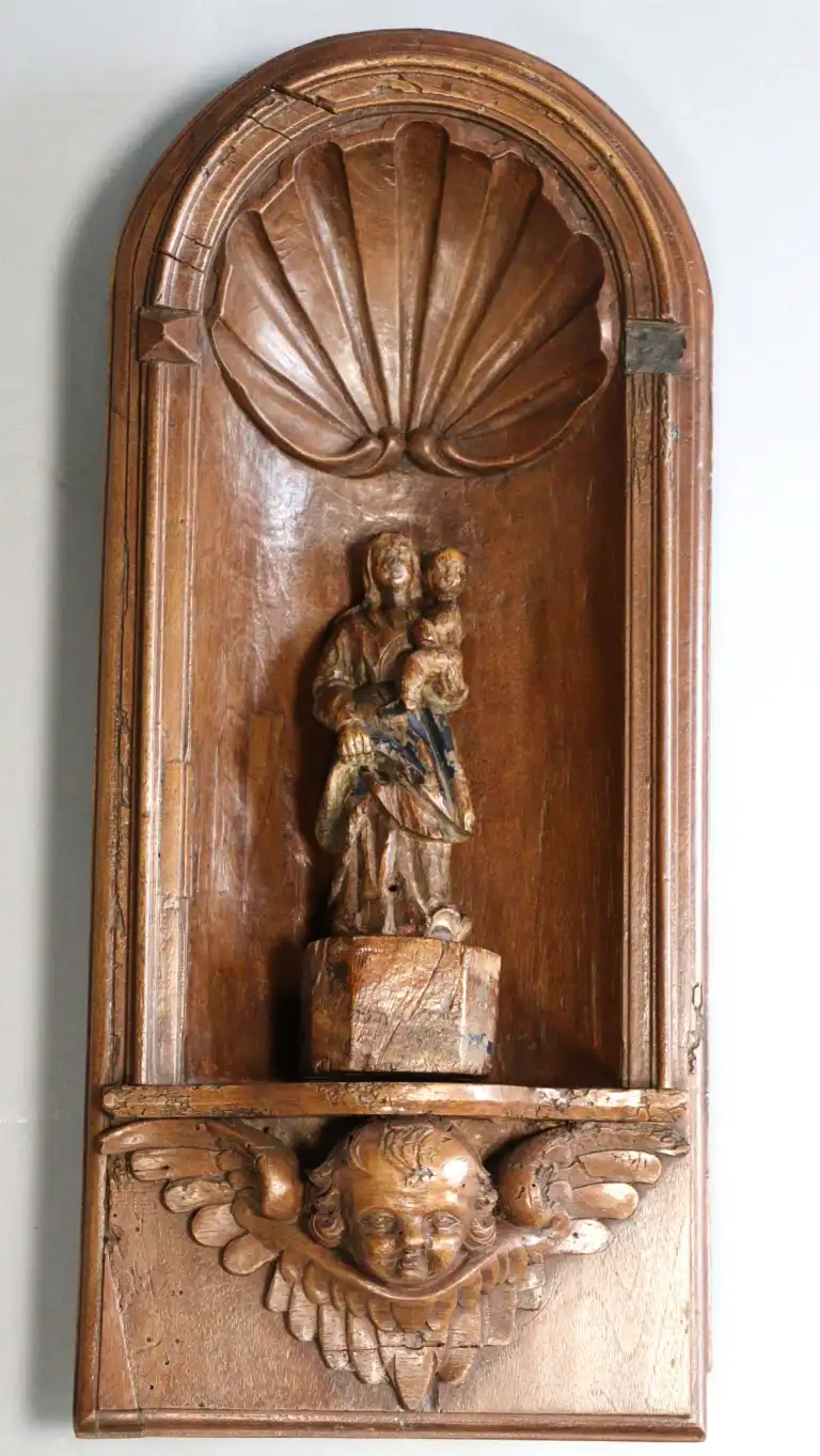 Lot comprenant : -Niche en noyer mouluré et sculpté (accidents, manques et restaurations), à décor de coquille et tête d'angelots. XVIIIème siècle. 49 x 22 x 6 cm -Vierge à l’Enfant en bois sculpté en ronde bosse, dos ébauché (accidents, manques et usures), traces de polychromie. H. : 20 cm