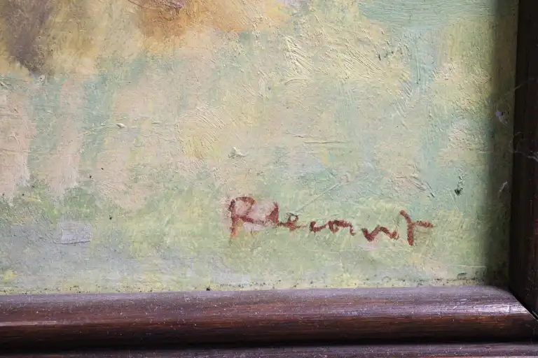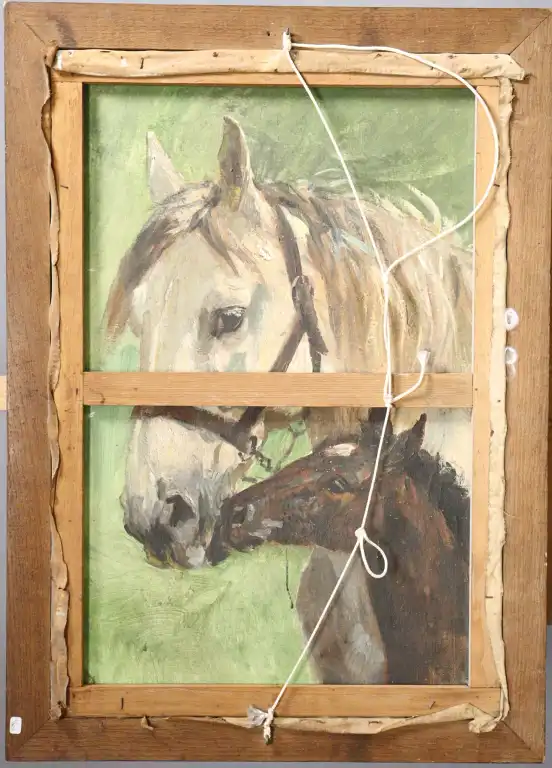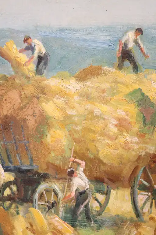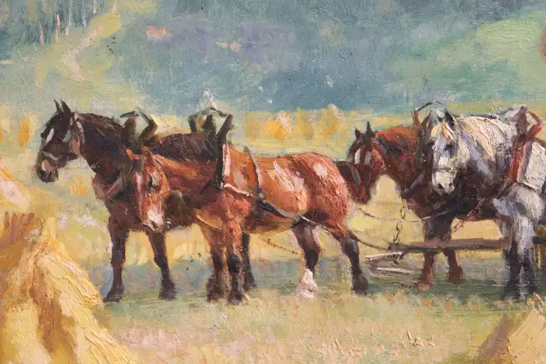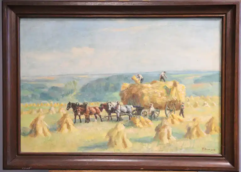 Raymond-Louis LECOURT (1882-1946). Paysage de moissons à la charrette. Huile sur toile, signée en bas à droite. Au dos : Etude de chevaux. 48 x 70 cm