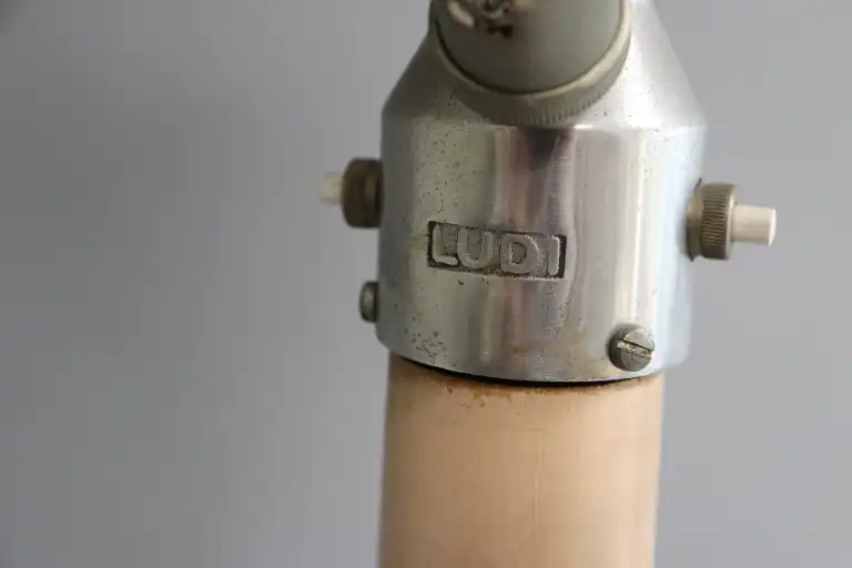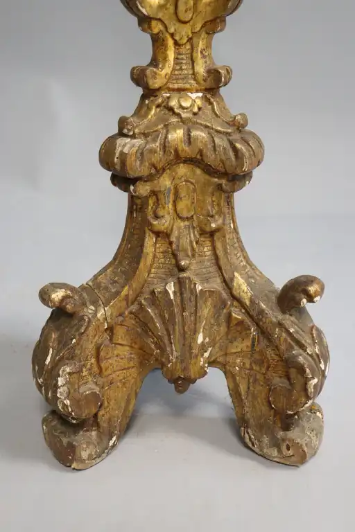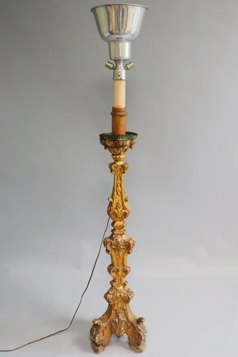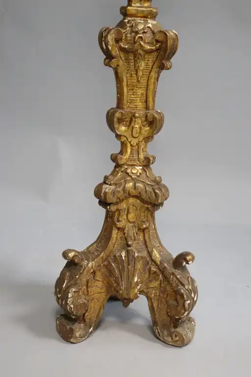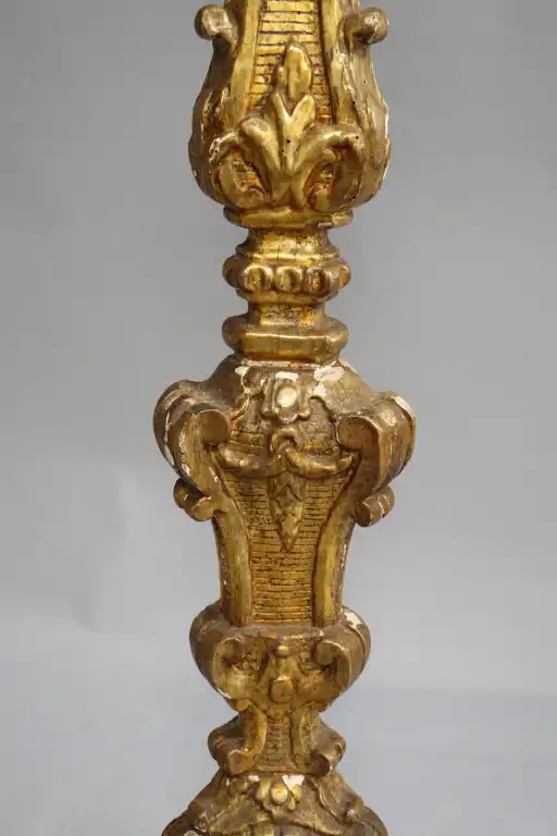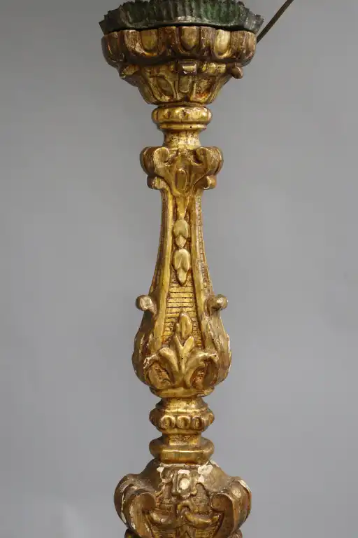 Candélabre en bois mouluré, sculpté et redoré (accidents, manques et restaurations), à décor de coquille, rinceaux et lambrequins. Epoque Louis XIV Monté en lampe. H. : 107 cm