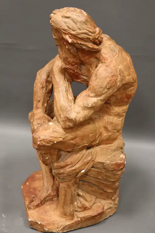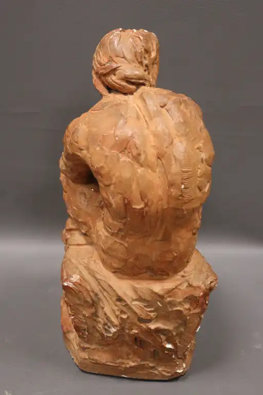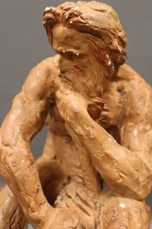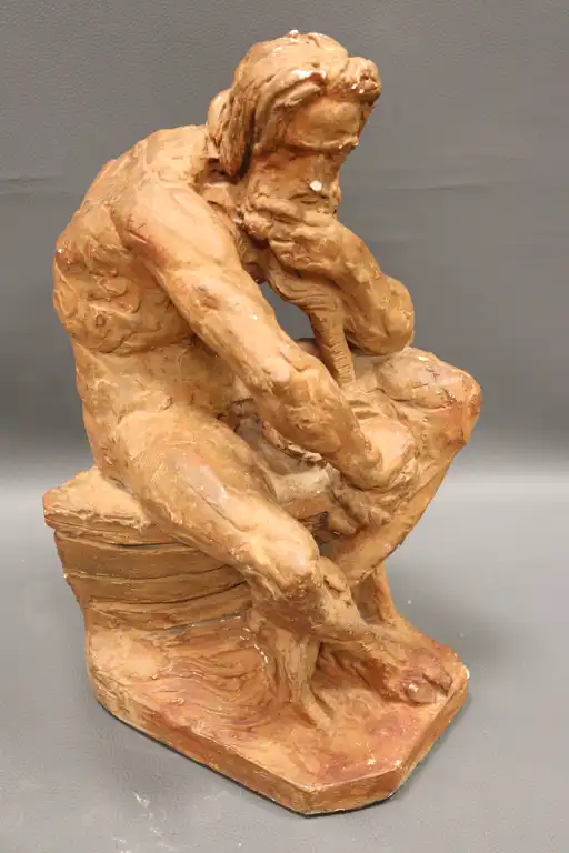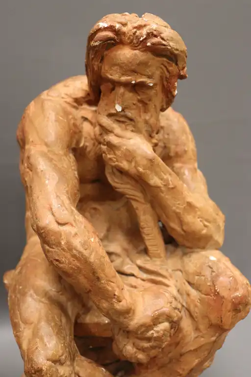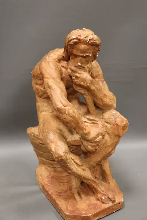 Satyre. Epreuve en plâtre patiné (usures) Signée et dédicacée en creux en partie illisible a mon ami Epiney / . fa guier y . H. : 44 cm