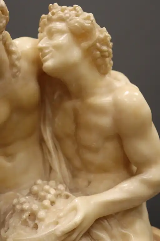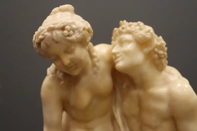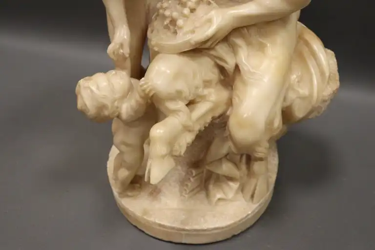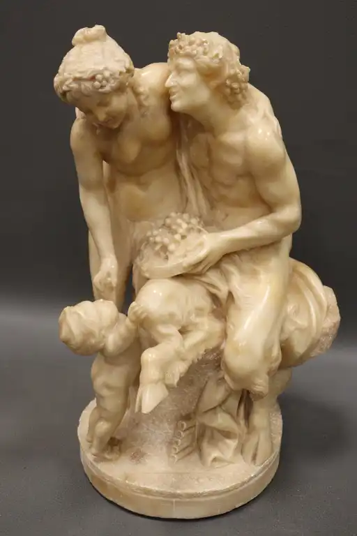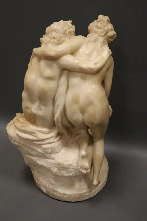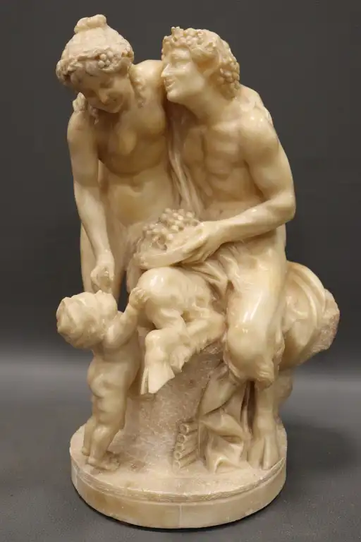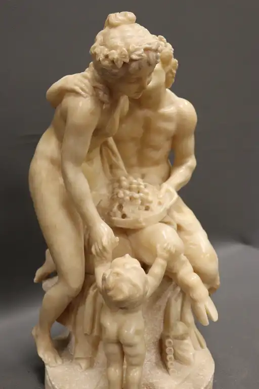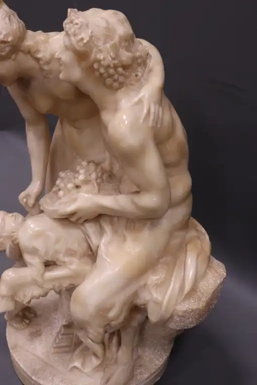 CLODION (d’après). Nymphe, faune et amour. Epreuve en albâtre sculpté en ronde bosse. (restaurations et accidents). H. : 42 cm