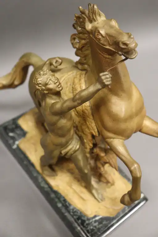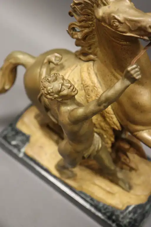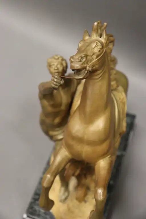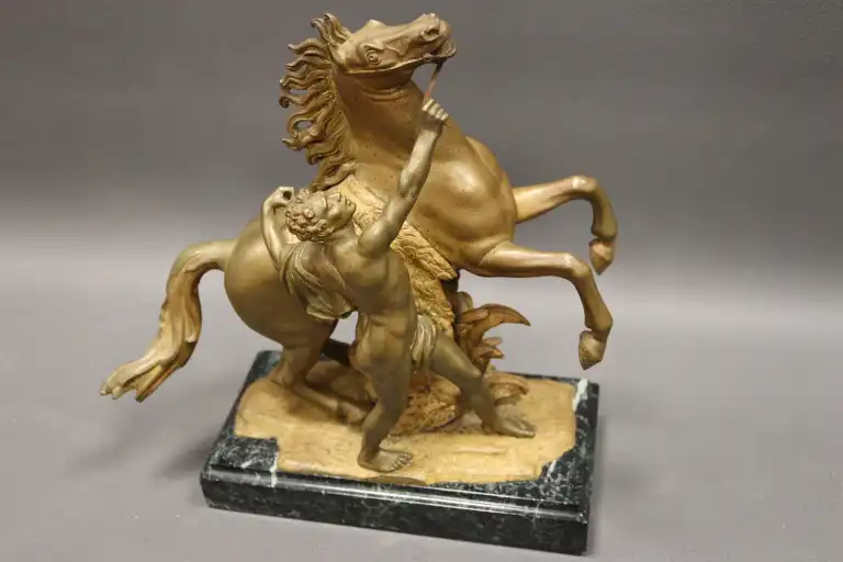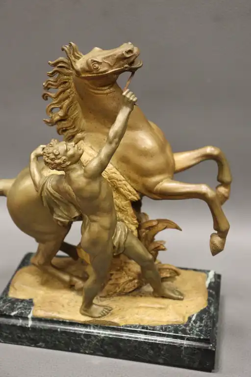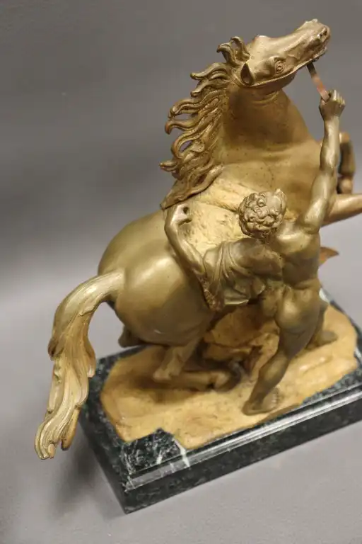 COUSTOU (d’après). Cheval de Marly. Epreuve en bronze à patine dorée. Contre socle en marbre vert (usures). 27 x 20 x 10 cm