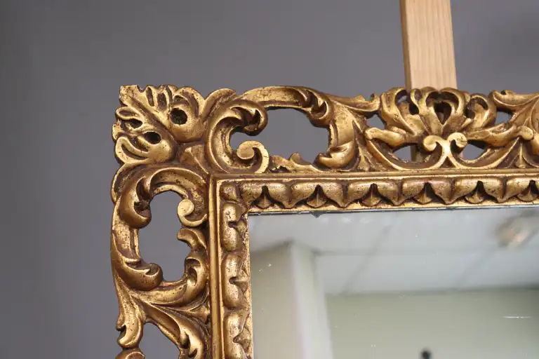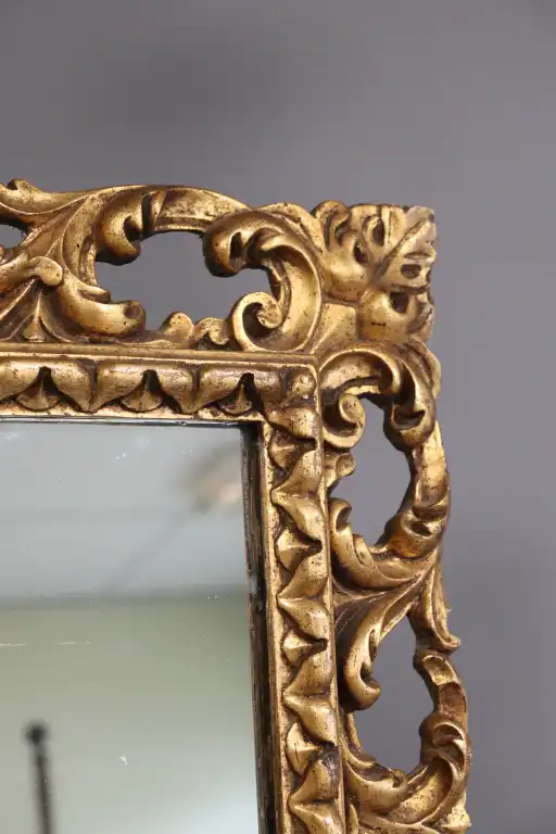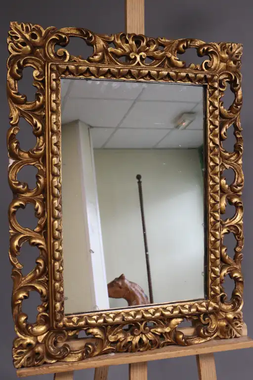Miroir quadrangulaire en bois mouluré et doré, à décor à jour de feuilles d’acanthe. Style Louis XV. 70 x 51 cm