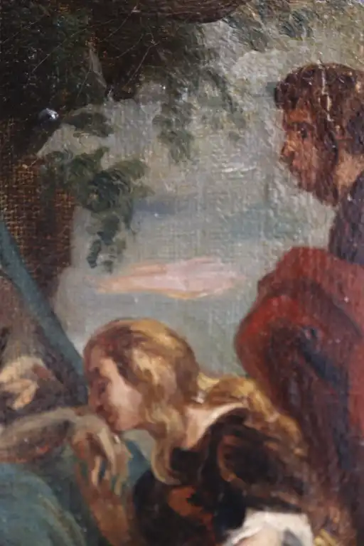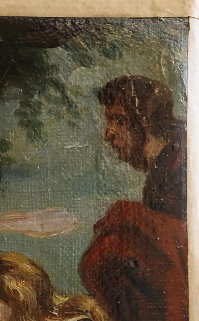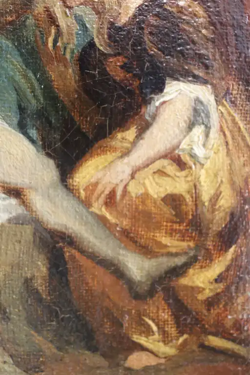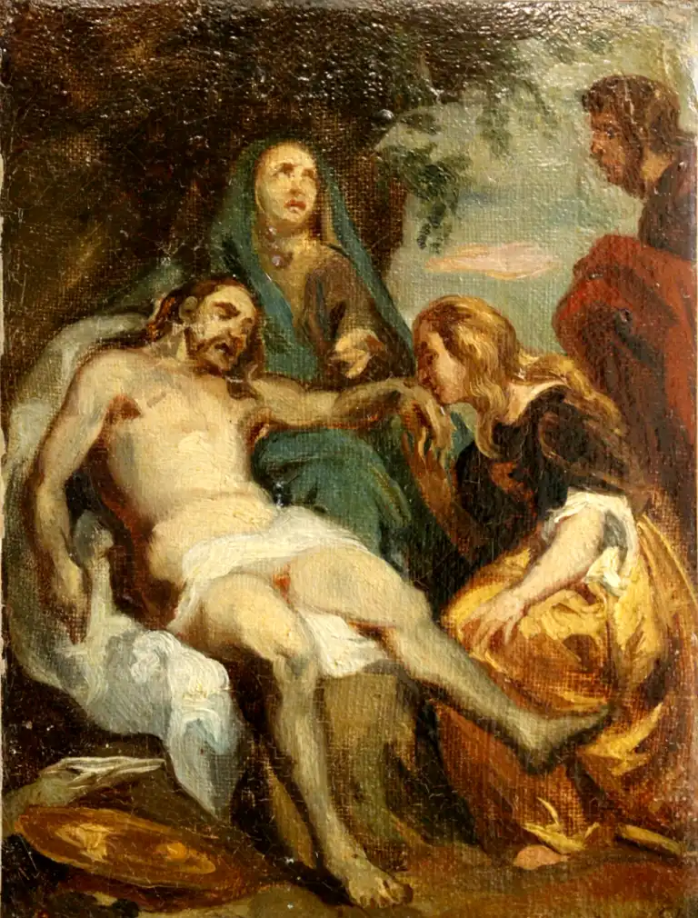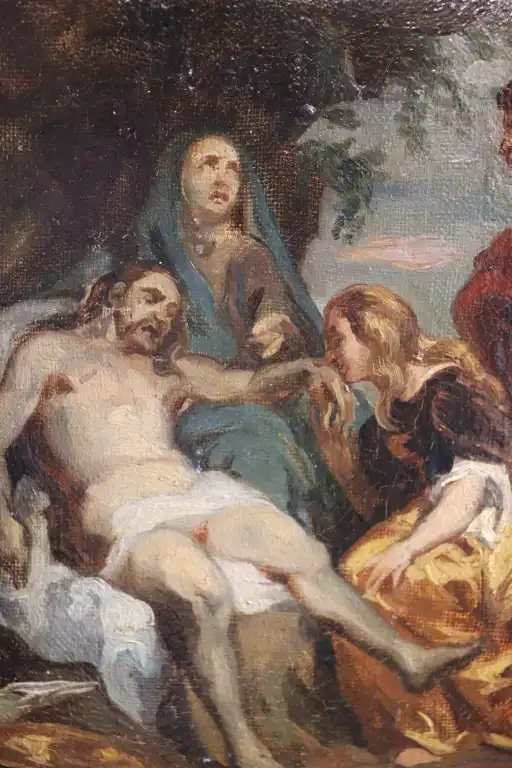 Ecole du XIXème siècle, d'après Van DYCK. Descente de Croix. Huile sur toile. 21,5 x 16,5 cm (Petits manques et usures)