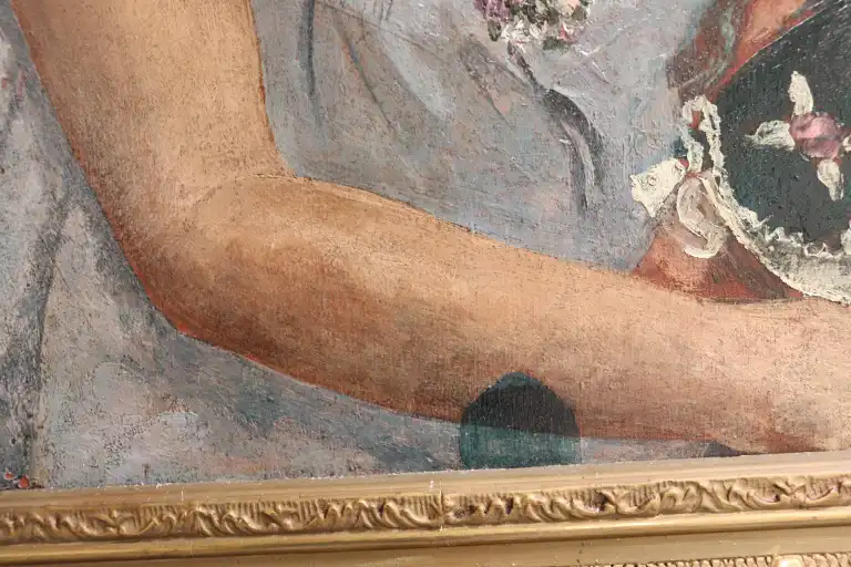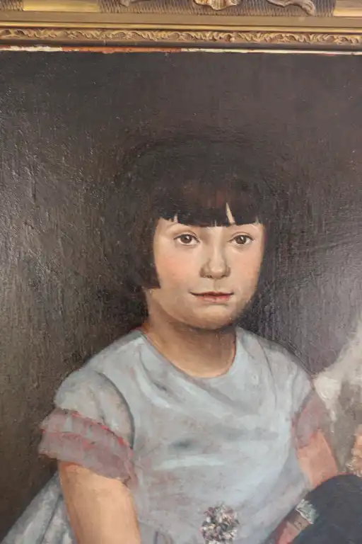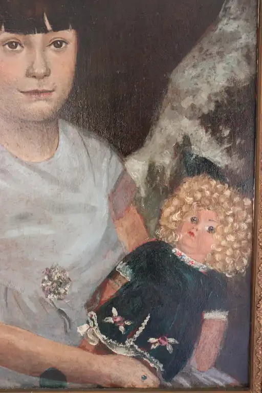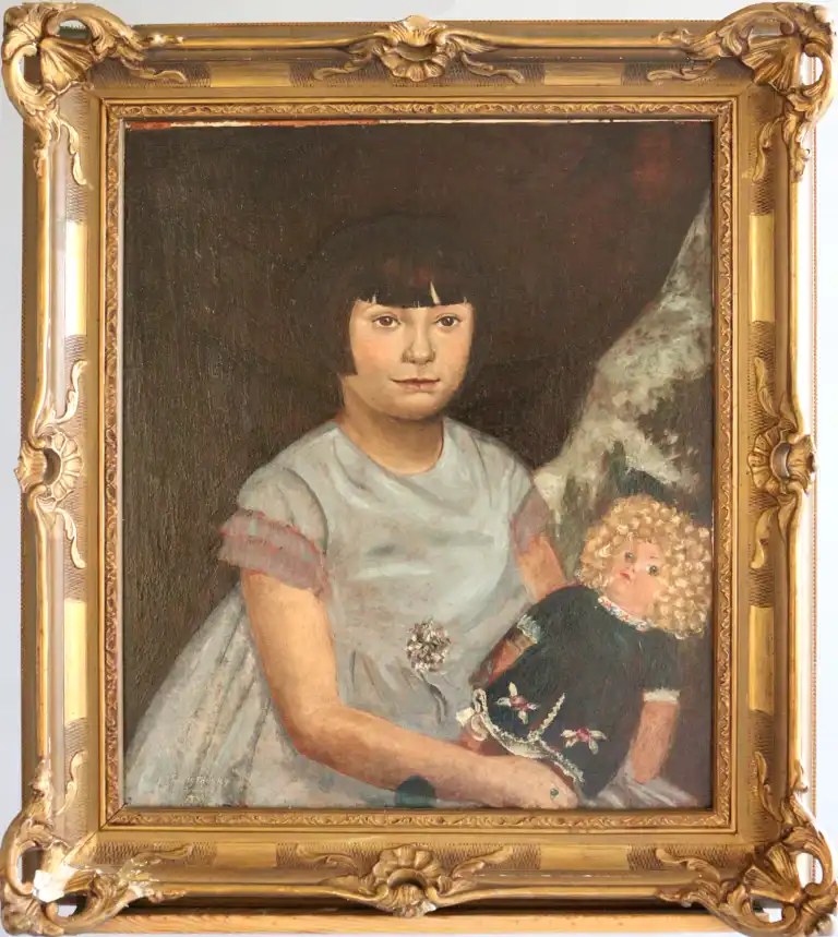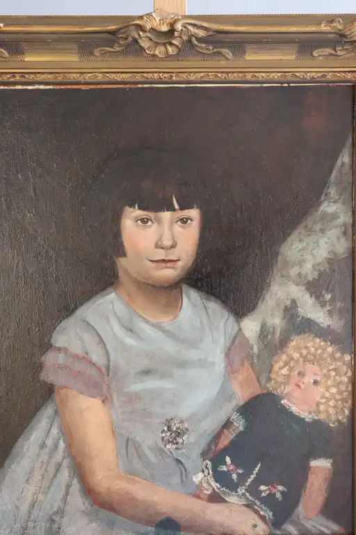 Ecole du XXème siècle. Jeune fille à la poupée, 1931. Huile sur panneau, signée, située à Paris et datée en bas à gauche. 55 x 46 cm